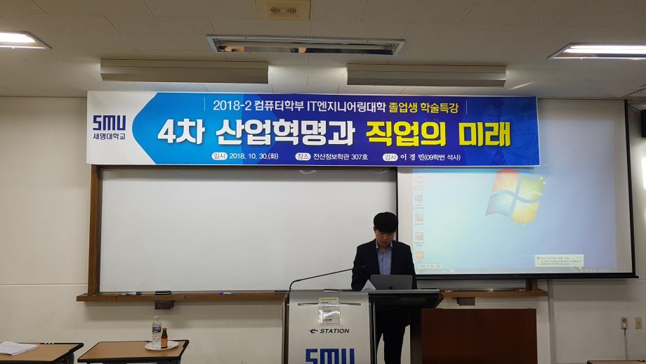 본문 시작 홈으로 학부활동 학부소개 학부활동 교육과정 커뮤니티 학부생활 입학안내 홈페이지가이드 학부갤러리 학부행사 학생회 활동 전공 동아리 학부갤러리 학부갤러리 페이스북 트위터 프린트 181030 IT단과대학 졸업생 취업특강 컴퓨터학부 7423 2018-10-30 전산 307호에서 컴퓨터학부 졸업생 전자부품연구원(KETI) 지능형영상처리센터 연구원 이경민(09학번, 2016년도 졸업) '4차 산업혁명과 직업의 미래' 라는 주제로 강의를 하였습니다. 목록 다음 181101 제1회 IT엔지니어링대학 학술발표대회 다음 181127 컴퓨터실무체험 교과목 취업특강 담당부서 : 컴퓨터학부 담당자 : - 연락처 : 043-649-1272 최종수정일 : 2024-10-26 만족도조사 만족도 조사 이 페이지에서 제공하는 정보에 대하여 만족하시나요? 매우만족 만족 보통 불만족 매우불만족