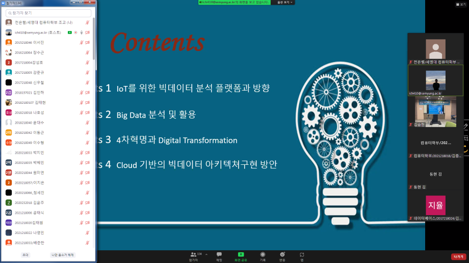 본문 시작 홈으로 학부활동 학부소개 학부활동 교육과정 커뮤니티 학부생활 입학안내 홈페이지가이드 학부갤러리 학부행사 학생회 활동 전공 동아리 학부갤러리 학부갤러리 페이스북 트위터 프린트 Creative Cube 를 활용한 4차 산업혁명 특강 컴퓨터학부 3567 2021-11-09 컴퓨터학부에서는 21.11.09(화) Creative Cube(첨단관 322호)에서 핀테크시대의 빅데이터 분석 및 활용 방안 - 교양대학 김기복 강사 의 주제로 Creative Cube 를 활용한 4차 산업혁명 특강을 진행하였습니다. 이번 특강은 대면특강 과 동시에 ZOOM을 활용한 실시간 송출을 진행하였으며 학부 학생 140명 가량이 참가하였고 성공적으로 마무리하였습니다. 목록 이전2021 한국컴퓨터종합학술대회 입상 다음 컴퓨터실무활용능력 자격증 특강 진행 담당부서 : 컴퓨터학부 담당자 : - 연락처 : 043-649-1272 최종수정일 : 2024-10-26 만족도조사 만족도 조사 이 페이지에서 제공하는 정보에 대하여 만족하시나요? 매우만족 만족 보통 불만족 매우불만족