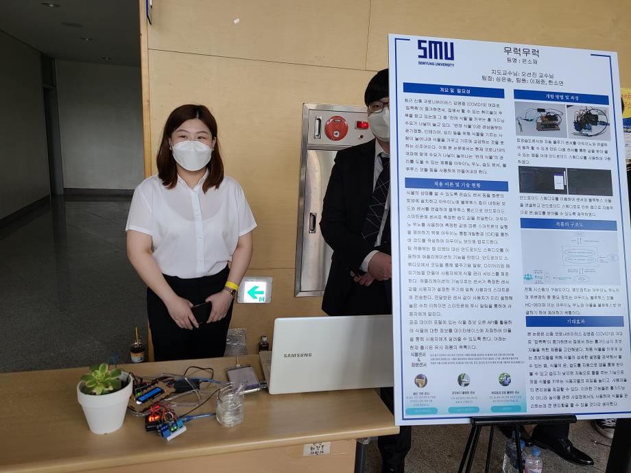 본문 시작 홈으로 SMIT 소식 SMIT 소개 SMIT 교육 SMIT 취업 SMIT 소식 SMIT 입학 홈페이지가이드 경진대회 공지사항 갤러리 경진대회 동아리 경진대회 페이스북 트위터 프린트 2021 캡스톤디자인 장려상 아두이노 습도센서를이용한식물케어 스마트IT학부 4427 2021-09-01 장려상 - 작품명 : 아두이노 습도센서를이용한식물케어 - 지도교수 : 오선진 - 팀원 : 심은송, 이재준, 한소연 코로나19 여파로 ‘집콕족'이 증가하면서 집에서 하는 홈가드닝의 초보자들을 위한 제품을 고안해냈다. 처음 식물을 키우게 되는 초보자들을 위해 센서를 이용하여 앱으로 받아보며 쉬운 식물관리를 도와줄 수 있는 제품을 개발하였다. 목록 이전2020-06-17 온라인 캡스톤디자인 경진대회 다음 2021 캡스톤디자인 장려상 LoRa를 이용한 킥보드 공유서비스 담당부서 : 스마트IT학부 담당자 : - 연락처 : 043-649-1275 최종수정일 : 2024-10-26 만족도조사 만족도 조사 이 페이지에서 제공하는 정보에 대하여 만족하시나요? 매우만족 만족 보통 불만족 매우불만족