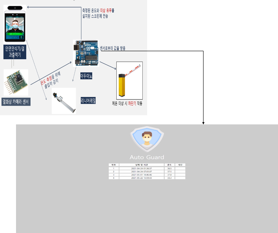 본문 시작 홈으로 SMIT 소식 SMIT 소개 SMIT 교육 SMIT 취업 SMIT 소식 SMIT 입학 홈페이지가이드 경진대회 공지사항 갤러리 경진대회 동아리 경진대회 페이스북 트위터 프린트 2021 캡스톤디자인 우수상 Arduino 기반 자동 높이 조절기능의 안면 체온 측정 장치 스마트IT학부 4638 2021-09-01 우수상 - 작품명 : Arduino 기반 자동 높이 조절기능의 안면 체온 측정 장치 - 지도교수 : 조면균 - 팀원 : 강진우, 정재범, 황원준, 이정환, 박세혁 코로나가 발병한 이후 실내에 출입할 때 체온 체크가 필수가 되었는데 고령자의 경우 거동이 불편하다 보니 얼굴을 체온계 높이에 맞추는 게 힘들다. 이에 Arduino 기반으로 높이를 자동으로 조정하고, 이상 체온의 경우 관리자에게 긴급하게 알린다. 목록 이전2021 캡스톤디자인 우수상 책 읽어드립니다 다음 2021 캡스톤디자인 우수상 Smart On Collar (S.O.C) 담당부서 : 스마트IT학부 담당자 : - 연락처 : 043-649-1275 최종수정일 : 2024-10-26 만족도조사 만족도 조사 이 페이지에서 제공하는 정보에 대하여 만족하시나요? 매우만족 만족 보통 불만족 매우불만족