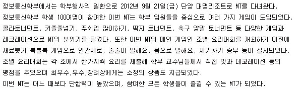 본문 시작 홈으로 SMIT 소식 SMIT 소개 SMIT 교육 SMIT 취업 SMIT 소식 SMIT 입학 홈페이지가이드 갤러리 공지사항 갤러리 경진대회 동아리 갤러리 페이스북 트위터 프린트 기업체험과 ACE 프로그램 일환 KT 견학 오선진 7435 2012-11-04 일시 : 2012년 10월 26일(금) 09:30 -18:00대상 : 정보통신학부 3,4학년 (70명)인솔 : 오선진 학부장, 이성재 교수출발장소 : 전산정보학관 앞 목록 이전2012년도 정보통신학부 연합 MT 다음 미드필더인증제 봉사활동 실시 담당부서 : 스마트IT학부 담당자 : - 연락처 : 043-649-1275 최종수정일 : 2024-10-26 만족도조사 만족도 조사 이 페이지에서 제공하는 정보에 대하여 만족하시나요? 매우만족 만족 보통 불만족 매우불만족