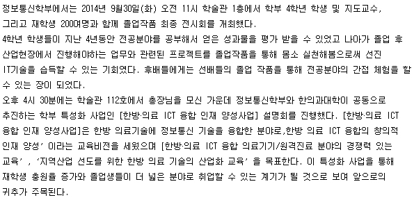 본문 시작 홈으로 SMIT 소식 SMIT 소개 SMIT 교육 SMIT 취업 SMIT 소식 SMIT 입학 홈페이지가이드 갤러리 공지사항 갤러리 경진대회 동아리 갤러리 페이스북 트위터 프린트 한방·의료 ICT 융합 인재 양성 사업단, 오송 국제 바이오 엑스포 견학 오선진 6962 2014-11-06 한방·의료 ICT 융합 인재 양성 사업단, 오송 국제 바이오 엑스포 견학 목록 이전정보통신학부 졸업작품 전시회 및 학부 특성화 사업 설명회 개최 다음 정보통신학부, 취업 전략을 위한 졸업생 특강 개최 담당부서 : 스마트IT학부 담당자 : - 연락처 : 043-649-1275 최종수정일 : 2024-10-26 만족도조사 만족도 조사 이 페이지에서 제공하는 정보에 대하여 만족하시나요? 매우만족 만족 보통 불만족 매우불만족
