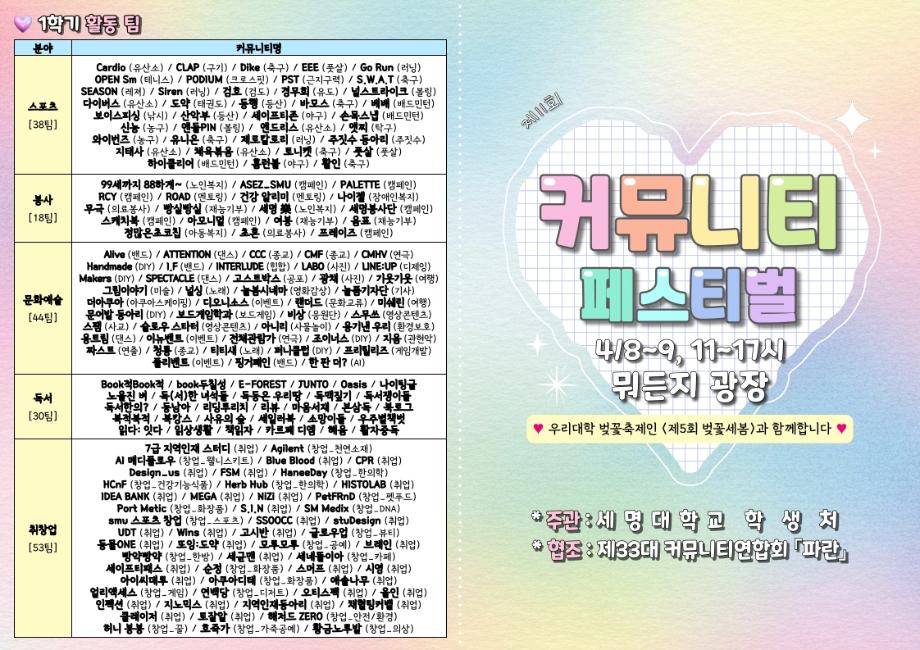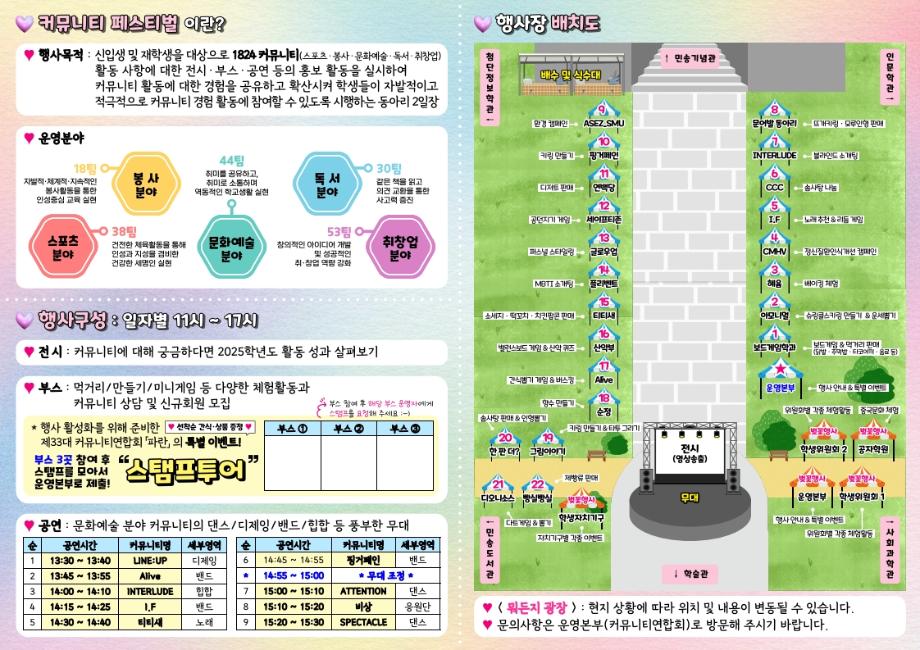 본문 시작 홈으로 SMIT 소식 SMIT 소개 SMIT 교육 SMIT 취업 SMIT 소식 SMIT 입학 홈페이지가이드 갤러리 공지사항 갤러리 경진대회 동아리 갤러리 페이스북 트위터 프린트 🎪 <제11회 커뮤니티 페스티벌> 시행 안내 🎪 스마트IT학부 13 2026-04-06 🎪 <제11회 커뮤니티 페스티벌> 시행 안내 🎪 목록 이전AI융합대학으로 명칭 변경! 다음 제 5회 세명대학교 벚꽃축제 '벚꽃세봄' 개최 안내 담당부서 : 스마트IT학부 담당자 : - 연락처 : 043-649-1275 최종수정일 : 2024-10-26 만족도조사 만족도 조사 이 페이지에서 제공하는 정보에 대하여 만족하시나요? 매우만족 만족 보통 불만족 매우불만족