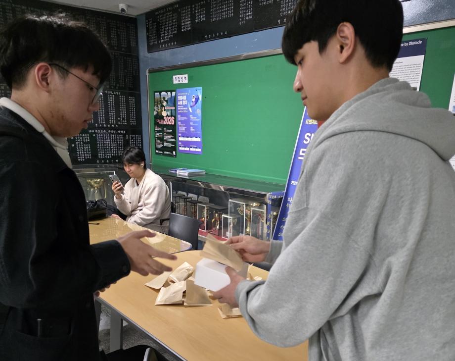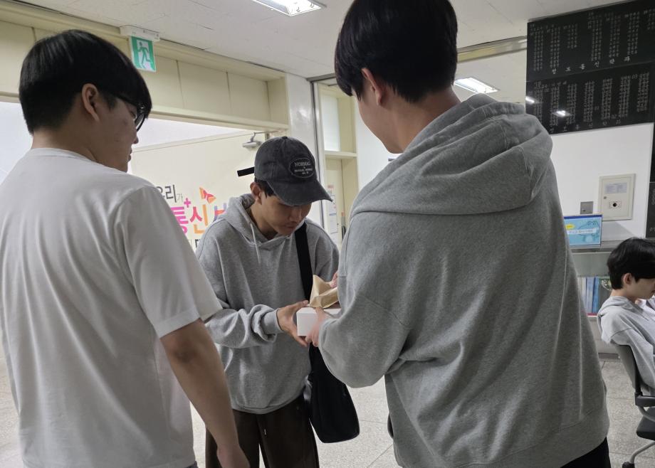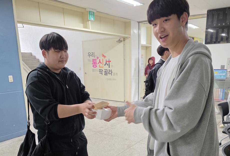 본문 시작 홈으로 SMIT 소식 SMIT 소개 SMIT 교육 SMIT 취업 SMIT 소식 SMIT 입학 홈페이지가이드 갤러리 공지사항 갤러리 경진대회 동아리 갤러리 페이스북 트위터 프린트 2026학년도 스마트IT학부 중간고사 간식나눔 이벤트👊 스마트IT학부 42 2026-04-20 안녕하세요 세명대학교 스마트IT학부입니다😀 2026년 4월 20일 신입생들을 위해 중간고사 응원 간식 나눔 행사를 진행하였습니다. 작은 선물이지만 열심히 준비한 만큼 맛있게 드셔주셔서 감사드리며, 머지않은 중간고사, 학우분들 화이팅하시고 노력한만큼 좋은 결과로 보답받으시길 응원합니다👊 목록 이전스마트IT알림_4월 : 스마트IT학부 졸업요건 담당부서 : 스마트IT학부 담당자 : - 연락처 : 043-649-1275 최종수정일 : 2024-10-26 만족도조사 만족도 조사 이 페이지에서 제공하는 정보에 대하여 만족하시나요? 매우만족 만족 보통 불만족 매우불만족
