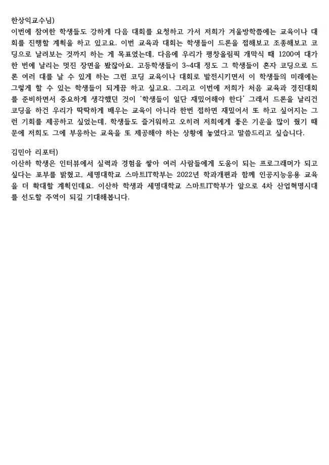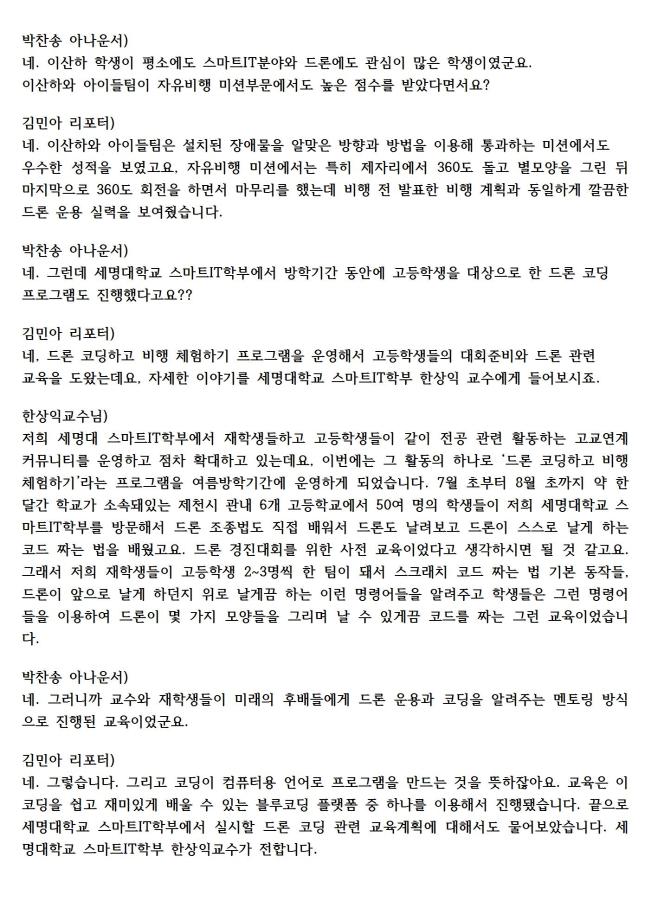 본문 시작 홈으로 SMIT 소식 SMIT 소개 SMIT 교육 SMIT 취업 SMIT 소식 SMIT 입학 홈페이지가이드 갤러리 공지사항 갤러리 경진대회 동아리 갤러리 페이스북 트위터 프린트 21.08.30(월) SM 스마트 드론 레이싱 경진대회 관련 라디오 출연 스마트IT학부 3824 2021-09-23 지난 8월19일(목)에 진행한 "SM 스마트 드론 레이싱 경진대회"와 관련하여 최우수상을 수상한 충주상업고 학생과 스마트IT학부 한상익교수님이 출연하여 수상소감대회 및 준비과정과 진행 방식등을 설명하였다. 목록 이전2021. SM 스마트 드론 레이싱 경진대회 기사 다음 2021.09.03(금) 스마트IT학부 한상익교수님 라디오 출연 담당부서 : 스마트IT학부 담당자 : - 연락처 : 043-649-1275 최종수정일 : 2024-10-26 만족도조사 만족도 조사 이 페이지에서 제공하는 정보에 대하여 만족하시나요? 매우만족 만족 보통 불만족 매우불만족