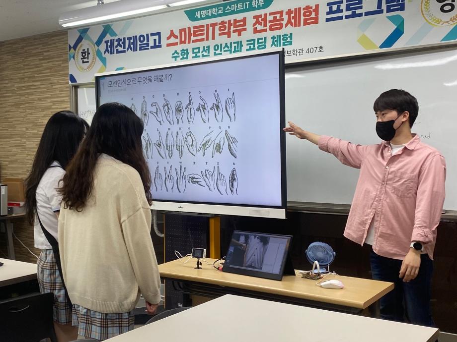 학부장의 세명대 스마트IT 학부 소개와 졸업생 진로 및 취업 현황, 스마트IT 학부 학회 임원소개, 캡스톤디자인 우수작품(수화모션인식)을 시현하였다.