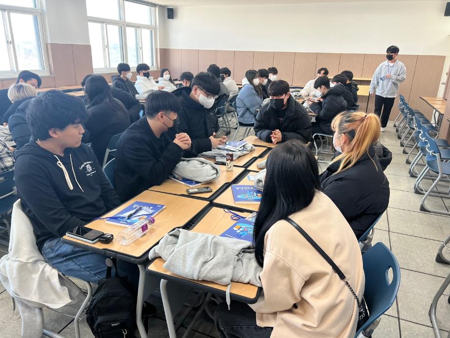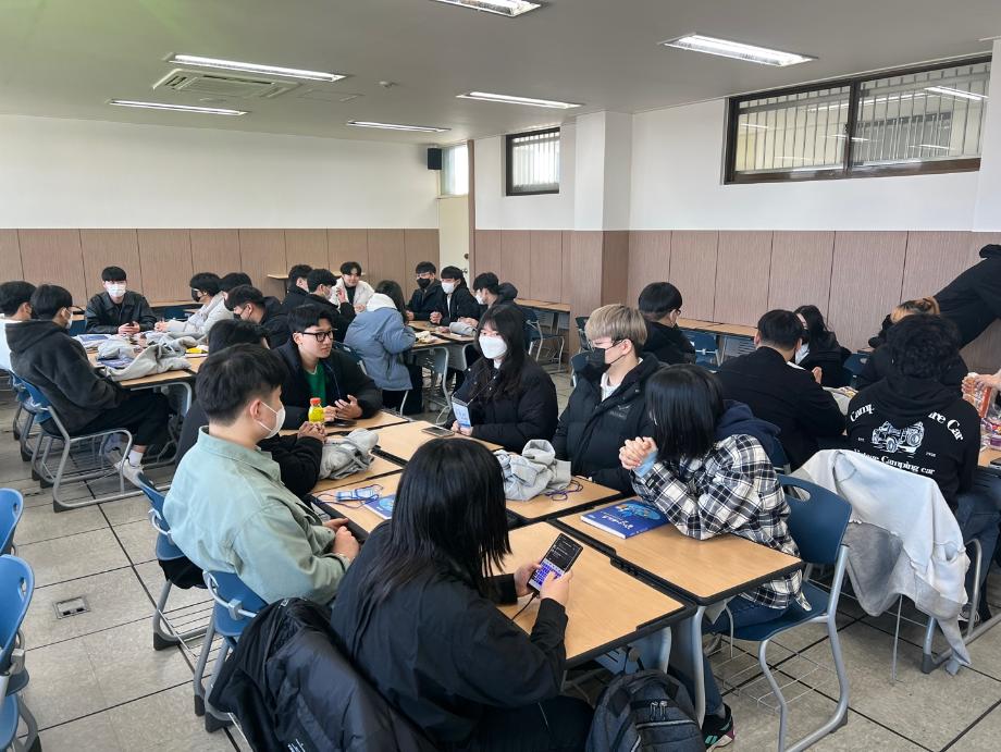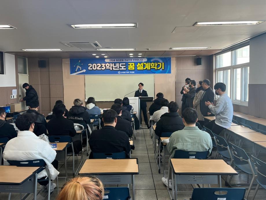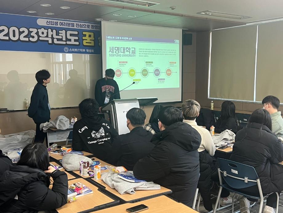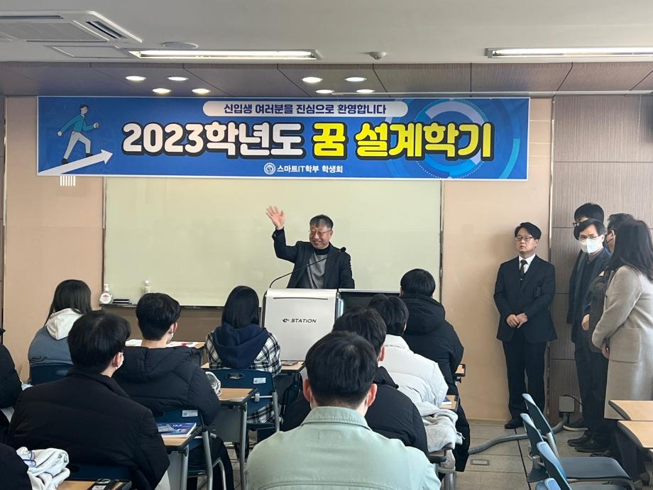 본문 시작 홈으로 SMIT 소식 SMIT 소개 SMIT 교육 SMIT 취업 SMIT 소식 SMIT 입학 홈페이지가이드 갤러리 공지사항 갤러리 경진대회 동아리 갤러리 페이스북 트위터 프린트 2023학년도 꿈 설계학기 1일차 스마트IT학부 7120 2023-02-20 스마트IT학부는 세명대학교 전체 신입생을 대상으로 하는 "꿈 설계학기"를 2023년 2월20일부터 22일까지 진행한다. 1일차는 첨단정보학관 321호에서 교수님 및 학회소개, 신입생들 자기소개, 졸업생 및 재학생 환영 영상 시청 등의 프로그램으로 이루어졌다. '꿈 설계학기'를 통해 신입생들의 학교에 대한 소속감이 고취될 수 있던 유익한 시간이었다. 목록 이전스마트IT학부 전기 학위수여식 다음 2023학년도 꿈 설계학기 2일차 담당부서 : 스마트IT학부 담당자 : - 연락처 : 043-649-1275 최종수정일 : 2024-10-26 만족도조사 만족도 조사 이 페이지에서 제공하는 정보에 대하여 만족하시나요? 매우만족 만족 보통 불만족 매우불만족