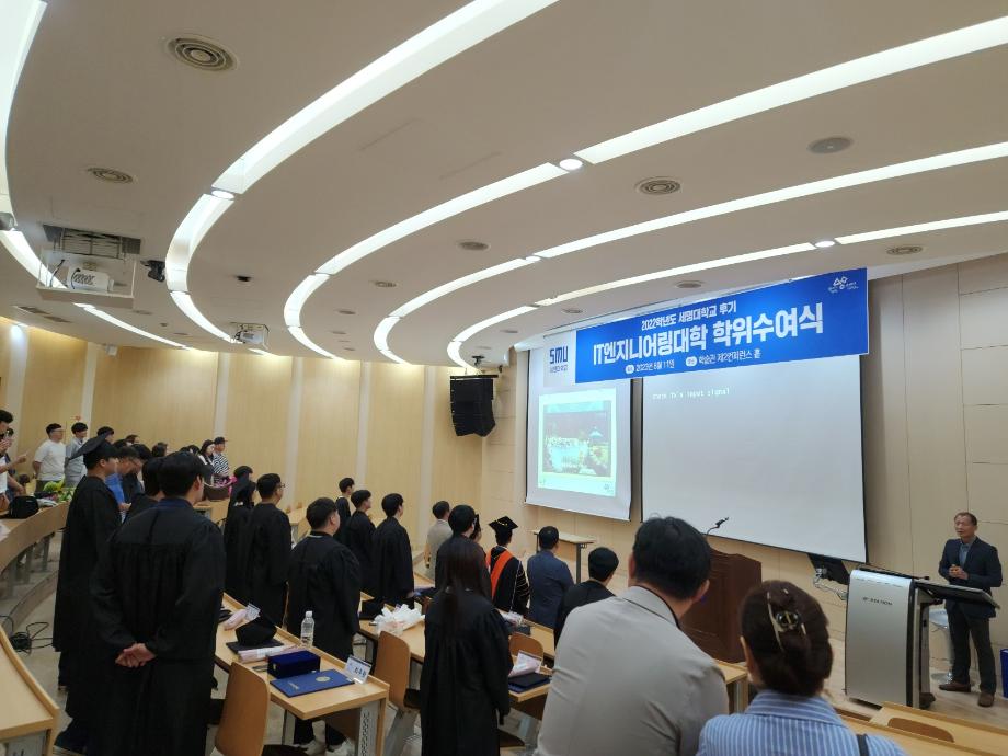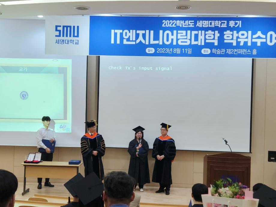 본문 시작 홈으로 SMIT 소식 SMIT 소개 SMIT 교육 SMIT 취업 SMIT 소식 SMIT 입학 홈페이지가이드 갤러리 공지사항 갤러리 경진대회 동아리 갤러리 페이스북 트위터 프린트 스마트IT학부 2022학년도 후기 학위수여식 스마트IT학부 7408 2023-08-11 스마트IT학부는 08월 11일(금) 학술관 102호에서 후기 학위수여식을 개최하였다. 후기 학위수여식은 IT엔지니어링 단과대학 주관으로 진행되었으며 스마트IT학부 6명의 졸업생이 학위를 수여받았다. 학위수여식에서 IT엔지니어링 단과대학 이완건 학장님과 총장님의 축사가 이루어졌다. 목록 이전스마트IT학부, "새온 자율주행 자동차 AI 미션 챌린지" 입상 다음 2023학년도 자기설계 해외배낭연수 담당부서 : 스마트IT학부 담당자 : - 연락처 : 043-649-1275 최종수정일 : 2024-10-26 만족도조사 만족도 조사 이 페이지에서 제공하는 정보에 대하여 만족하시나요? 매우만족 만족 보통 불만족 매우불만족