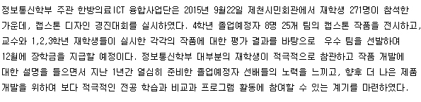 본문 시작 홈으로 SMIT 소식 SMIT 소개 SMIT 교육 SMIT 취업 SMIT 소식 SMIT 입학 홈페이지가이드 갤러리 공지사항 갤러리 경진대회 동아리 갤러리 페이스북 트위터 프린트 한방-의료ICT 융합사업단, 융합전공 동아리 오리엔테이션 진행 관리자 6251 2015-09-30 한방-의료ICT 융합사업단, 융합전공 동아리 오리엔테이션 진행 목록 이전한방-의료ICT 융합사업단, 캡스톤 디자인 경진대회 실시 다음 사물 인터넷 국제 전시회 담당부서 : 스마트IT학부 담당자 : - 연락처 : 043-649-1275 최종수정일 : 2024-10-26 만족도조사 만족도 조사 이 페이지에서 제공하는 정보에 대하여 만족하시나요? 매우만족 만족 보통 불만족 매우불만족