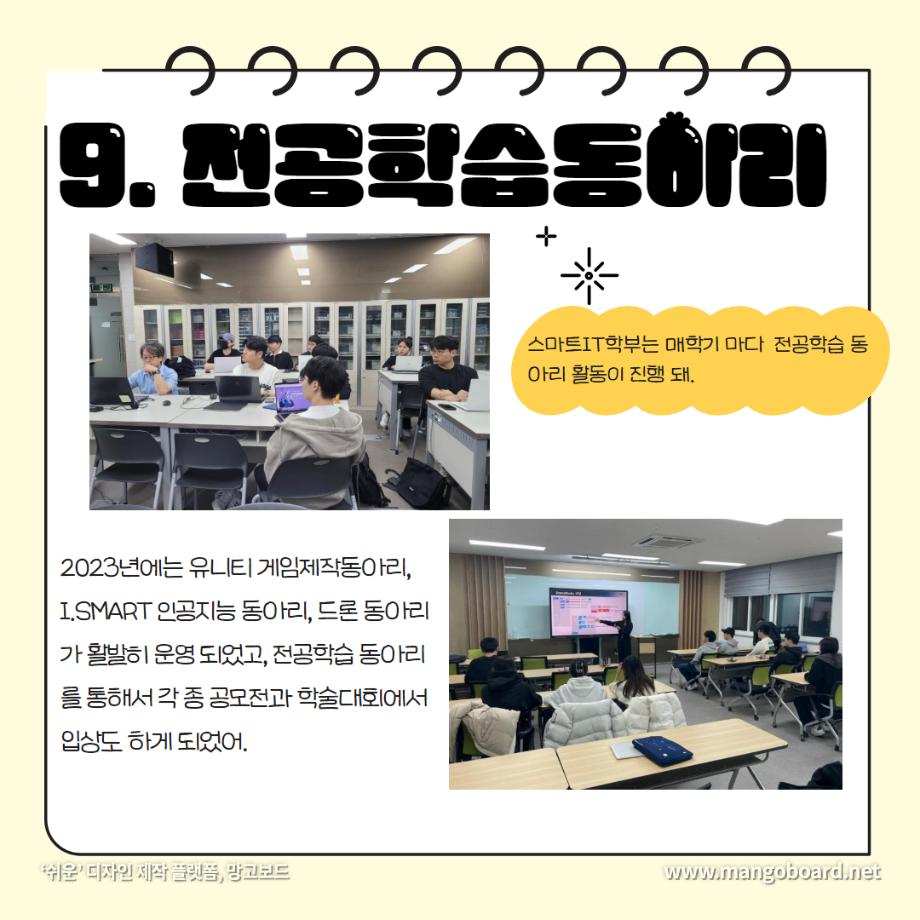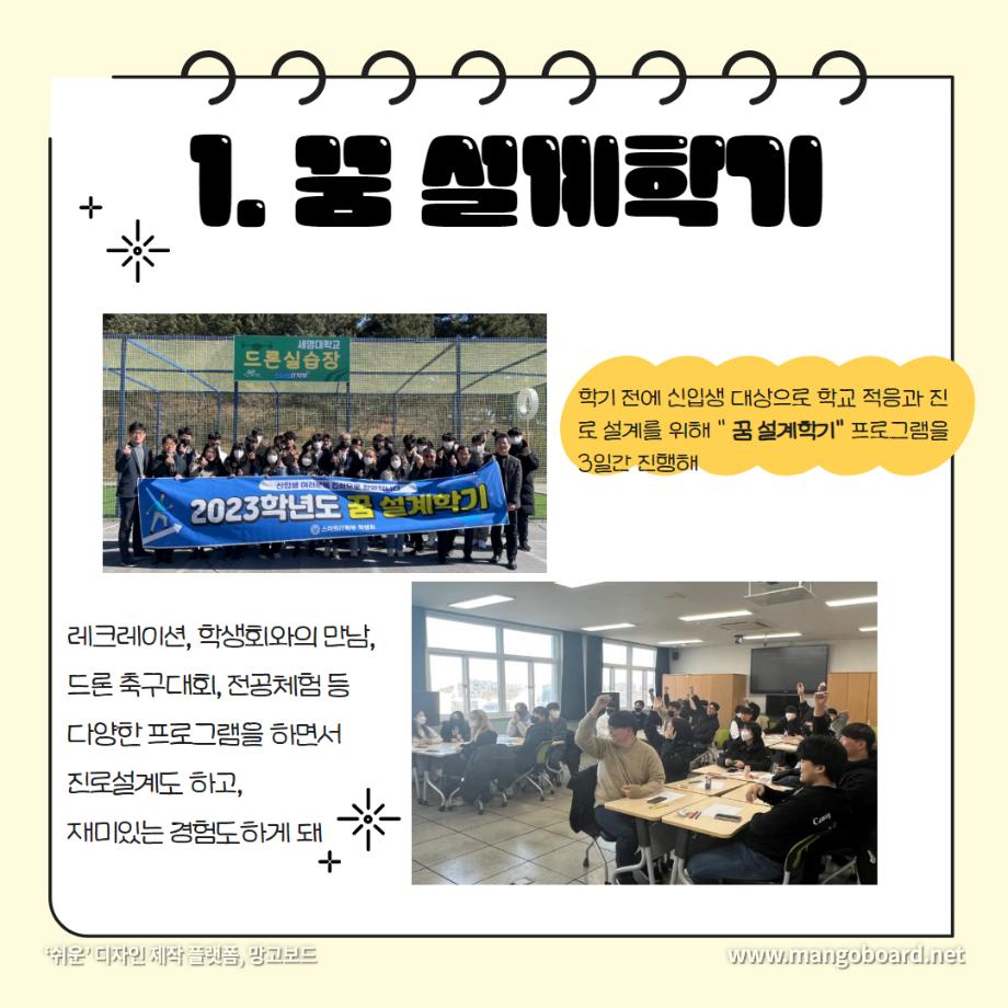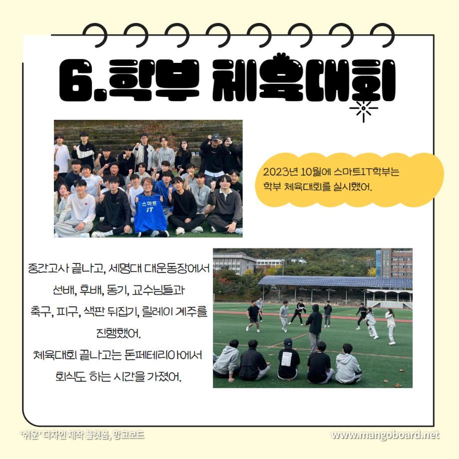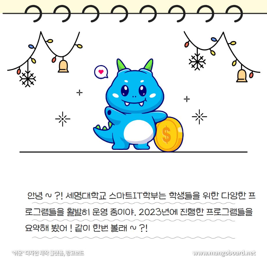 본문 시작 홈으로 SMIT 소식 SMIT 소개 SMIT 교육 SMIT 취업 SMIT 소식 SMIT 입학 홈페이지가이드 갤러리 공지사항 갤러리 경진대회 동아리 갤러리 페이스북 트위터 프린트 세명대학교 스마트IT학부는 이런 활동을 한다 ❗ 스마트IT학부 2723 2024-01-04 세명대학교 스마트IT학부는 이런 활동을 한다 ❗ 안녕하세요. 세명대학교 스마트IT학부입니다. 😍 2023년도에 진행한 스마트IT학부의 유익하고 즐거웠던 프로그램들 함께 보실까요 ?!😊 세명대 스마트IT학부는 재학생들을 위한 다양하고 재미있는 프로그램들이 활발히 운영하고 있습니다. ❤️ 목록 이전2023-2학기 드론 동아리 시행🎈 다음 실무경험 ? 자격증? 취업 All in 세명대학교 스마트IT학부 담당부서 : 스마트IT학부 담당자 : - 연락처 : 043-649-1275 최종수정일 : 2024-10-26 만족도조사 만족도 조사 이 페이지에서 제공하는 정보에 대하여 만족하시나요? 매우만족 만족 보통 불만족 매우불만족