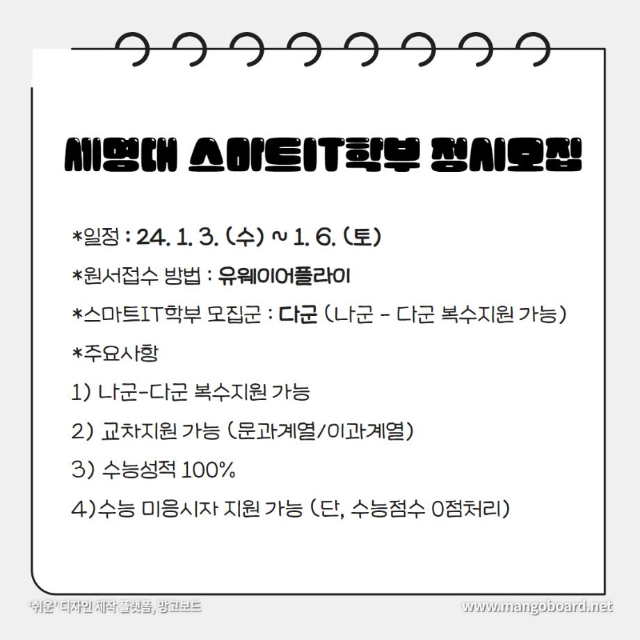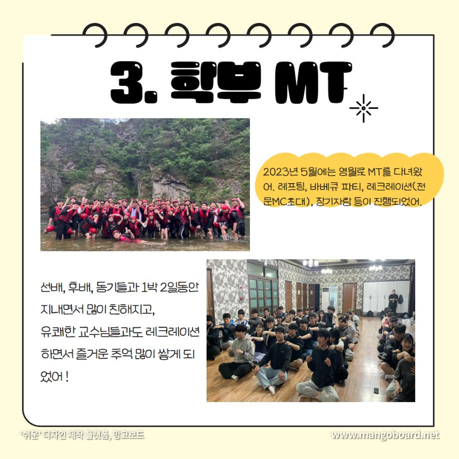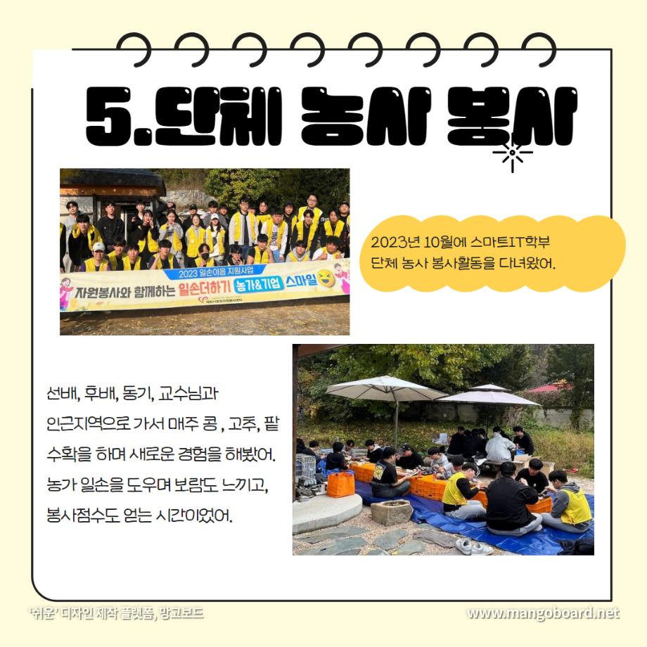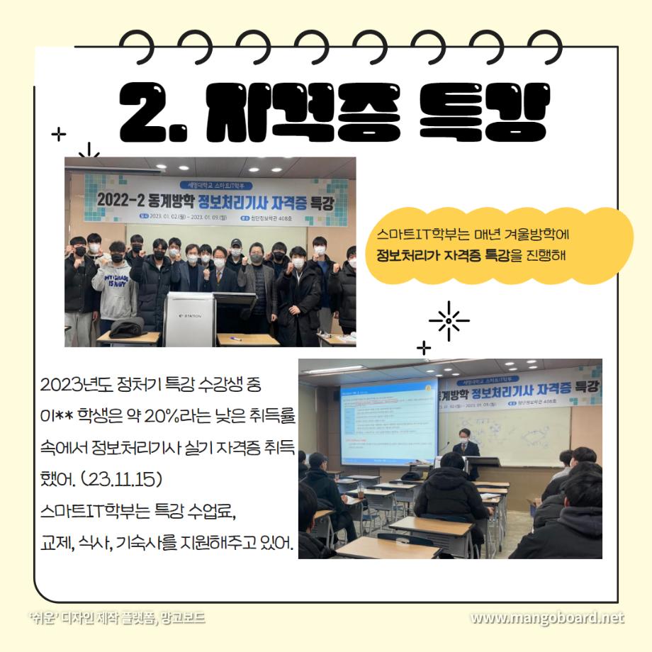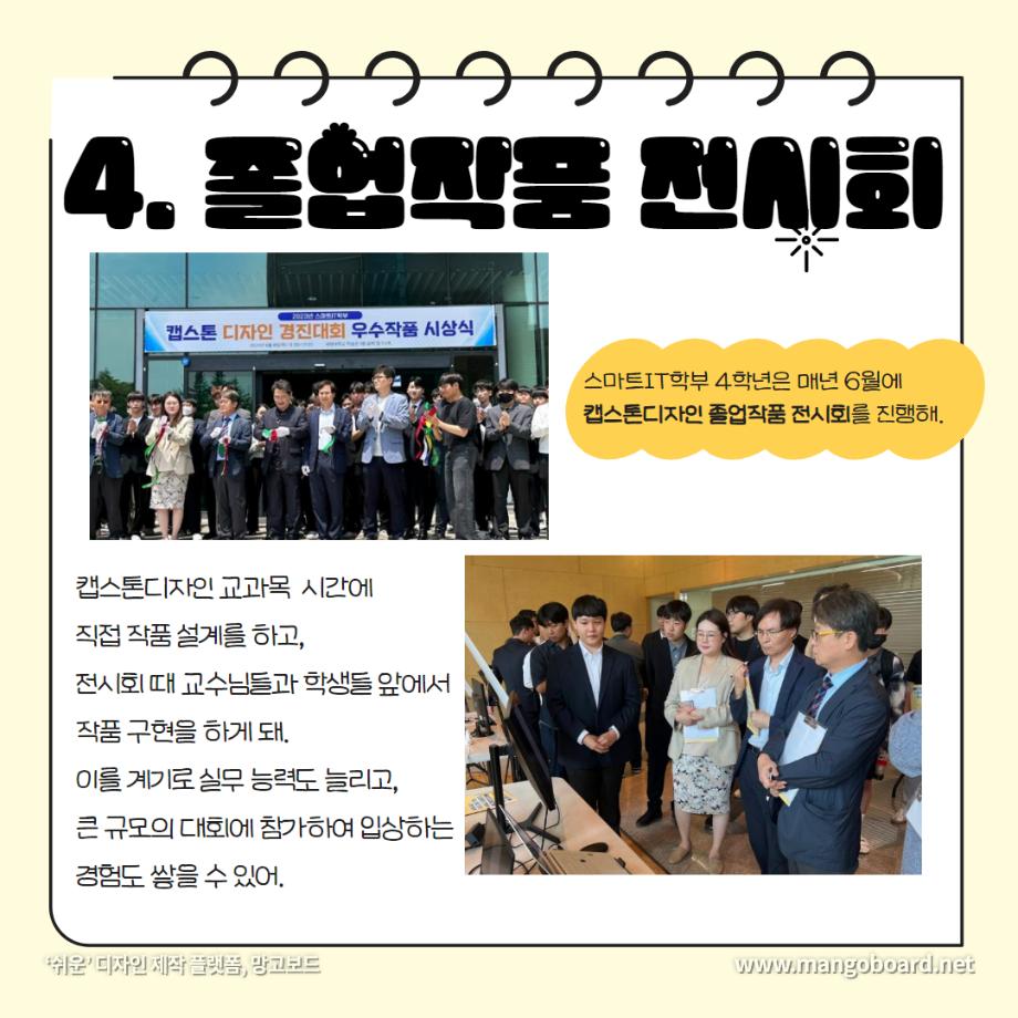 본문 시작 홈으로 SMIT 소식 SMIT 소개 SMIT 교육 SMIT 취업 SMIT 소식 SMIT 입학 홈페이지가이드 갤러리 공지사항 갤러리 경진대회 동아리 갤러리 페이스북 트위터 프린트 세명대학교 스마트IT학부는 이런 활동을 한다 ❗ 스마트IT학부 2723 2024-01-04 세명대학교 스마트IT학부는 이런 활동을 한다 ❗ 안녕하세요. 세명대학교 스마트IT학부입니다. 😍 2023년도에 진행한 스마트IT학부의 유익하고 즐거웠던 프로그램들 함께 보실까요 ?!😊 세명대 스마트IT학부는 재학생들을 위한 다양하고 재미있는 프로그램들이 활발히 운영하고 있습니다. ❤️ 목록 이전2023-2학기 드론 동아리 시행🎈 다음 실무경험 ? 자격증? 취업 All in 세명대학교 스마트IT학부 담당부서 : 스마트IT학부 담당자 : - 연락처 : 043-649-1275 최종수정일 : 2024-10-26 만족도조사 만족도 조사 이 페이지에서 제공하는 정보에 대하여 만족하시나요? 매우만족 만족 보통 불만족 매우불만족