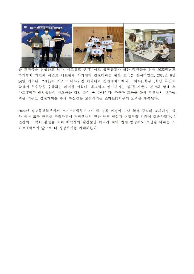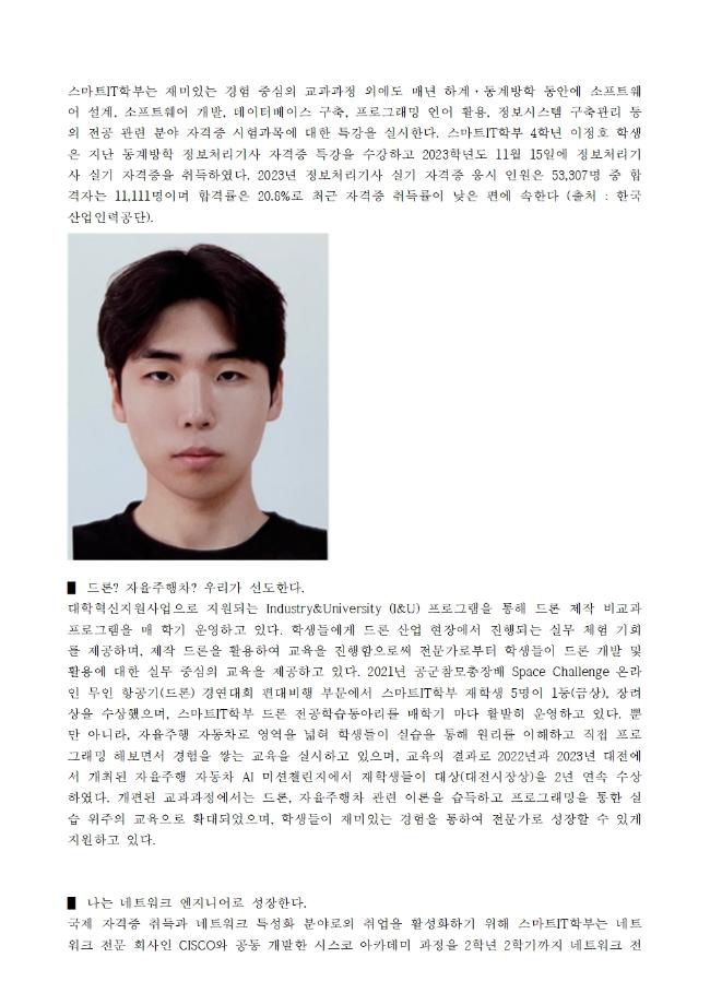 본문 시작 홈으로 SMIT 소식 SMIT 소개 SMIT 교육 SMIT 취업 SMIT 소식 SMIT 입학 홈페이지가이드 갤러리 공지사항 갤러리 경진대회 동아리 갤러리 페이스북 트위터 프린트 실무경험 ? 자격증? 취업 All in 세명대학교 스마트IT학부 스마트IT학부 2928 2024-01-04 안녕하세요. 세명대학교 스마트IT학부입니다. 스마트IT학부 보도자료 내용입니다. 실무경험? 자격증? 취업? All in 세명대학교 스마트IT학부! -실무능력을 중심으로 교과과정 개편 -자격증? 어려워도 우리는 자신있다 ! -드론? 자율주행차? 우리가 선도한다 -나는 네트워크 엔지니어로 성장한다. 목록 이전세명대학교 스마트IT학부는 이런 활동을 한다 ❗ 다음 동계방학 특별활동 “정보처리기사 자격증 특강” 실시!📚 담당부서 : 스마트IT학부 담당자 : - 연락처 : 043-649-1275 최종수정일 : 2024-10-26 만족도조사 만족도 조사 이 페이지에서 제공하는 정보에 대하여 만족하시나요? 매우만족 만족 보통 불만족 매우불만족