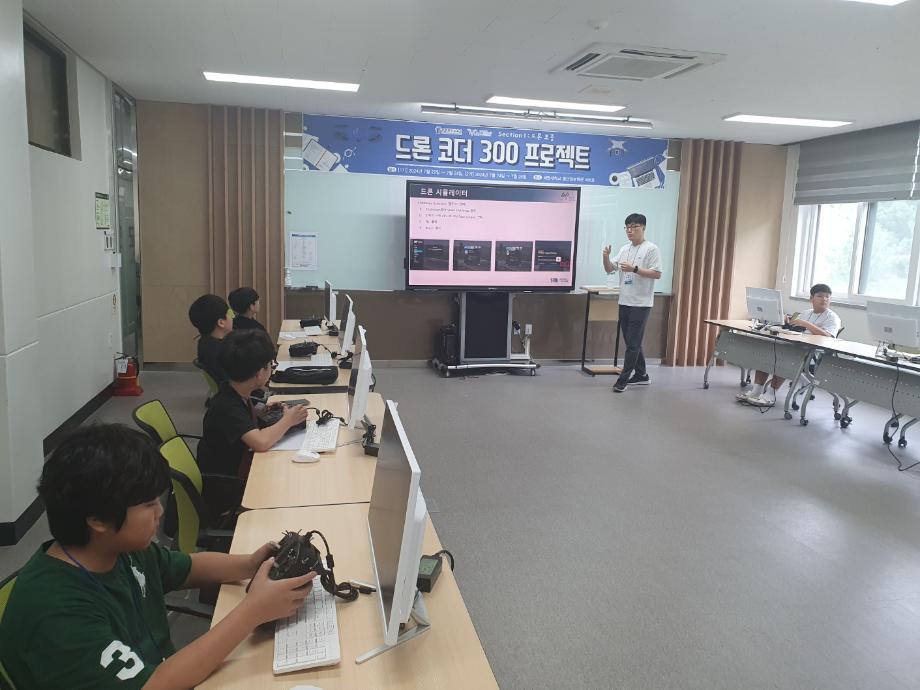 드론코더300 프로젝트 방학프로그램은 드론 조종, 드론 코딩, 자율주행차 아두이노 코딩 3개 영역 총 20시간으로 구성되었으며, 세명대학교 스마트IT학부 한상익 교수가 교육을 총괄하였고 재학생 6명이 보조 교사로 참여하였다. 참여 학생들은 드론 조종 시뮬레이터를 활용하여 조종 실습을 해보고, 유소년 축구 드론을 이용하여 실제 드론 조종 경험을 해볼 수 있었다. 스크레치 코딩으로 드론이 다양한 모양을 그리며 비행하고 LED 모듈에 원하는 그림도 코딩으로 그려보았으며, C언어를 이용하여 자율주행차가 주어진 경로를 주행할 수 있게 코딩하는 시간을 가졌다. 보조 교사 1명이 3~4명의 학생을 담당하여 교육의 질을 향상할 수 있었다.