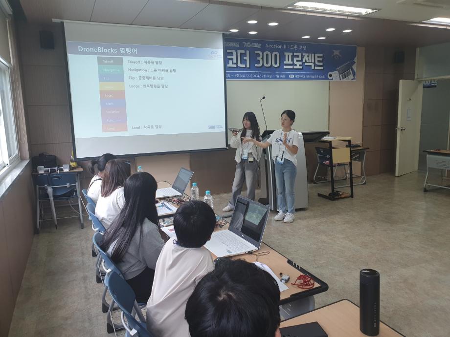 세명대학교 스마트IT학부는 2024년 7월 22일부터 충북교육청의 사업 지원을 받아 ‘드론코더300 프로젝트’ 방학프로그램을 진행하였다. 교육 대상자는 제천, 충주, 단양지역 초등학교 5학년 학생들이었으며, 7월 22일부터 24일까지 1기 20명, 7월 24일부터 26일까지 2기 22명, 총 42명의 학생이 선정되어 교육에 참여하였다. 교육은 숙박형 캠프 형식으로 진행되었으며 세명대학교의 기숙사와 학생식당, 스마트IT학부의 시설을 활용하여 진행되었다.