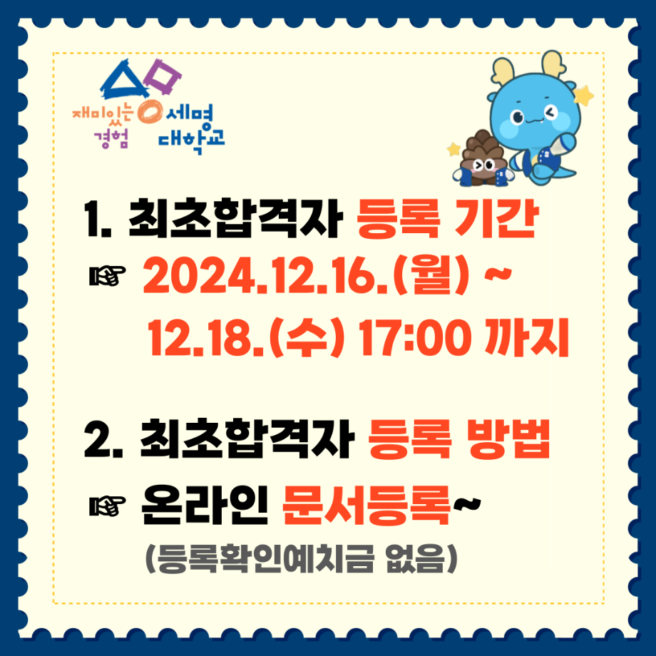본문 시작 홈으로 SMIT 소식 SMIT 소개 SMIT 교육 SMIT 취업 SMIT 소식 SMIT 입학 홈페이지가이드 갤러리 공지사항 갤러리 경진대회 동아리 갤러리 페이스북 트위터 프린트 수시모집 최초 합격자 발표 안내 스마트IT학부 1997 2024-12-17 수시모집 최초 합격자 발표 안내 입니다!! 자세한 내용은 세명대학교 입학홈페이지 참고 (https://ipsi.semyung.ac.kr/) 목록 이전◈ 스마트IT학부 졸업작품 중간발표회 진행 다음 2025학년도 수시모집 충원합격자 발표/등록 안내 담당부서 : 스마트IT학부 담당자 : - 연락처 : 043-649-1275 최종수정일 : 2024-10-26 만족도조사 만족도 조사 이 페이지에서 제공하는 정보에 대하여 만족하시나요? 매우만족 만족 보통 불만족 매우불만족