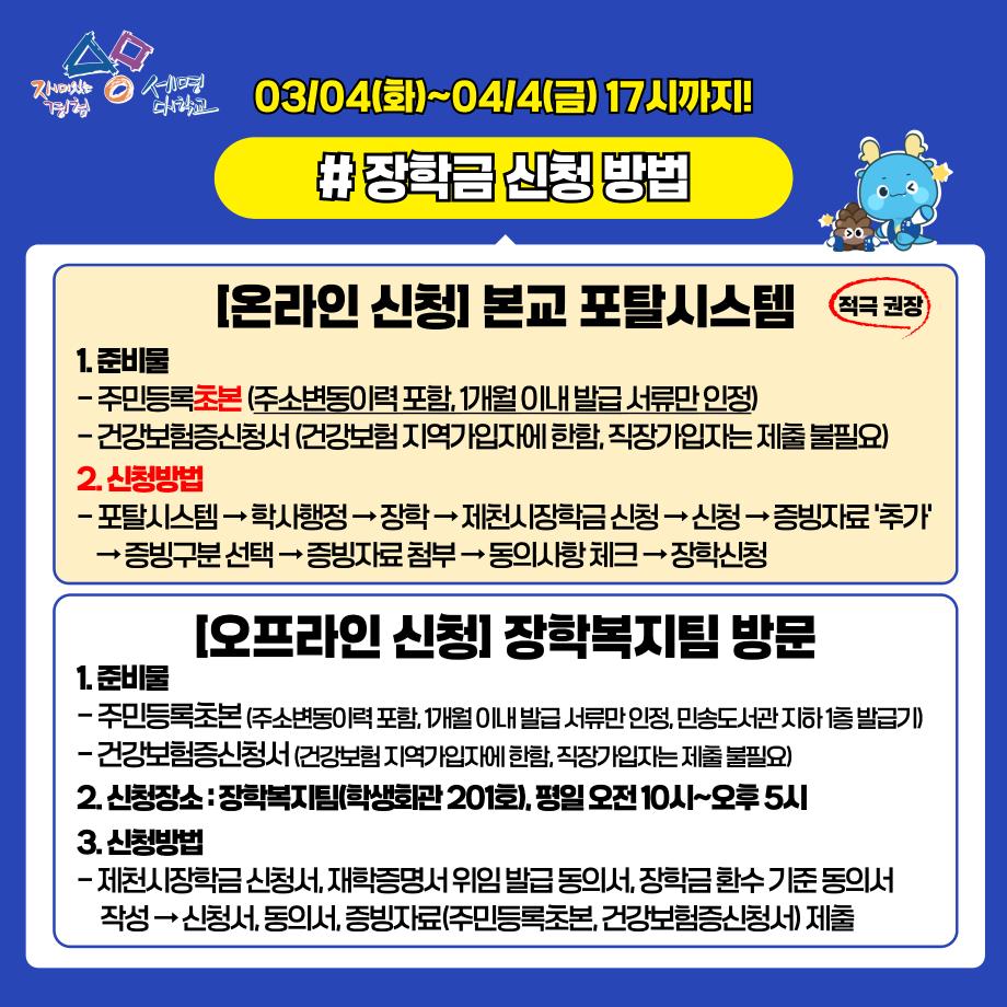 ※ 온라인 신청 방법 : 본교 포탈시스템 → 학사행정 → 장학 → 제천시장학금신청