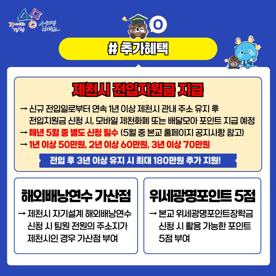 - 제천시 장학금 : 1인당 100만원(생활비성, 재학 중 1회에 한하여 수혜 가능)