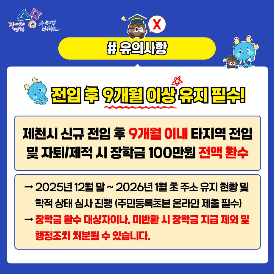 - 제천시장학금 수혜자는 제천시 신규 전입일로부터 연속 1년 이상 제천시 관내 주소를 유지할 시 제천시 전입지원금(주소 유지 연차별 50~70만원)신청가능