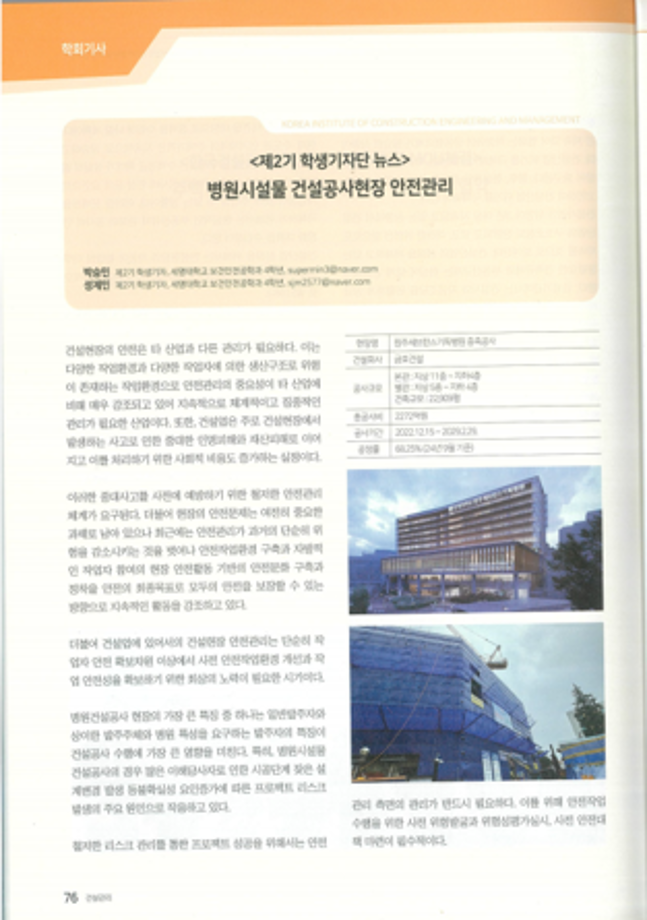 학회지 기사 : “병원시설물 건설공사현장 안전관리”