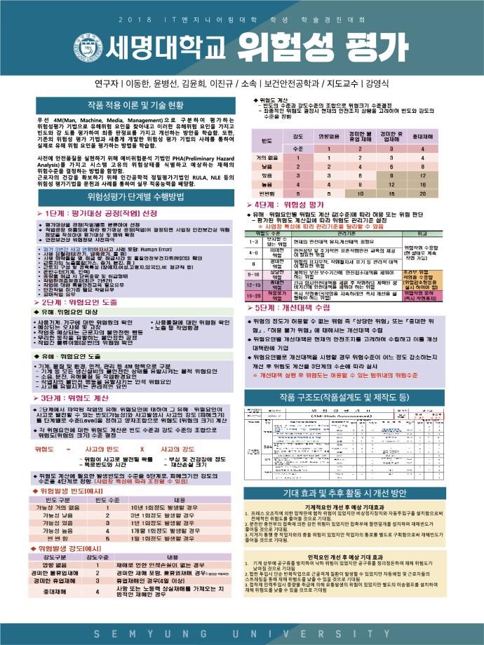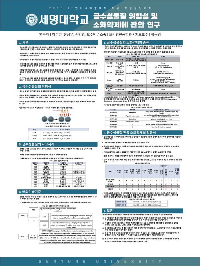 본문 시작 홈으로 커뮤니티 학과소개 진로 및 취업 교수소개 학과과정 커뮤니티 홈페이지가이드 포토갤러리 학과공지 학사일정 포토갤러리 학생회 학과영상 보건안전학과 인스타 보건안전학과 블로그 포토갤러리 페이스북 트위터 프린트 IT엔지니어링대학 학술발표대회 수상작 보건안전공학과 8070 2018-11-20 2018년 11월 1일 IT엔지니어링대학 학술발표대회 수상작 - 금 상 : Ethanol의 화재 · 폭발특성치의 측정 및 예측 양유환, 이원희, 김민정 - 장려상 : 금수성물질의 위험성과 소화약제에 관한 연구 이주헌,진상우,손민경,오수빈 -장려상 : 위험성 평가 이동한, 이진규, 윤병선, 김윤희 목록 이전제1회 IT엔지니어링대학 학술발표대회 다음 제 25회 세명대학교 보건안전공학과 학위수여식 담당부서 : 보건안전학과 담당자 : - 연락처 : 043-649-1777 최종수정일 : 2024-10-26 만족도조사 만족도 조사 이 페이지에서 제공하는 정보에 대하여 만족하시나요? 매우만족 만족 보통 불만족 매우불만족