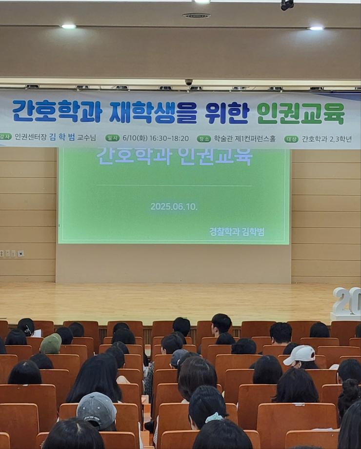내용: 간호학과는 지난 2025년 6월 10일(화), 재학생들을 대상으로 인권센터장(경찰학과 교수) 김학범 교수님을 초청하여 인권교육 특강을 진행하였습니다. 교수님은 대학생으로서, 향후 간호사로서 의료현장에서 일을 할 때 주의해야 할 사례를 중심으로 실제 법적 기준을 적용한 다양한 내용을 쉽게 설명해 주셨습니다.