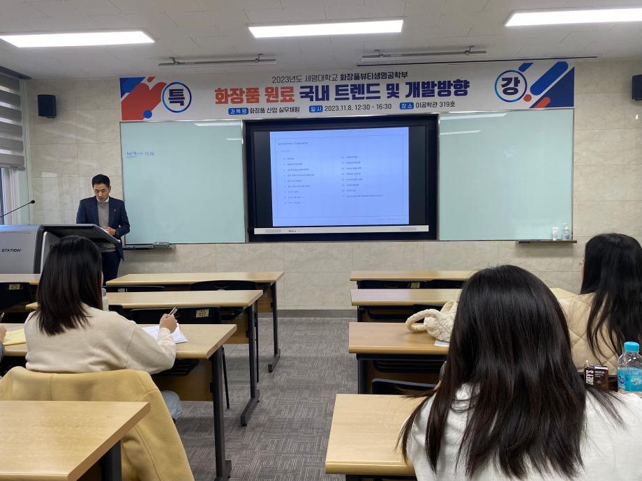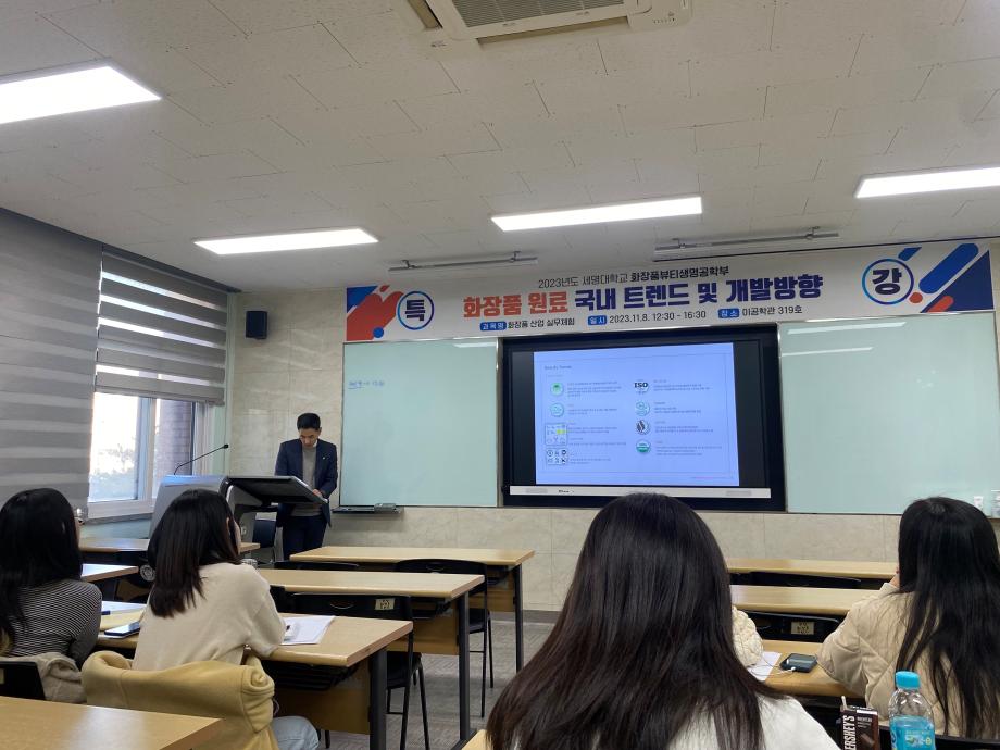 본문 시작 홈으로 커뮤니티 학과소개 학과과정 대학원 커뮤니티 연구동아리 홈페이지가이드 포토갤러리 학과공지 채용정보 학과일정 포토갤러리 유튜브 인스타그램 취업현황 학생회 조직도 졸업생 숏터뷰 포토갤러리 페이스북 트위터 프린트 2023학년도 화장품산업실무체험 제5회 특강 화장품뷰티학부 2791 2023-11-09 세상코스메틱(Dr.G) 박준우 R&D 본부장님께서 진행하신 <화장품 원료 국내 트렌드 및 개발방향> 에 대하여 강의해주셨습니다. 목록 이전2023학년도 2학기 화장품 산업 실무체험 제4회 전문가 초청 특강 다음 S-BOOT 2차 전문가 초빙 취업코칭 특강 담당부서 : 바이오코스메틱학과 담당자 : - 연락처 : 043-649-1638 최종수정일 : 2024-10-26 만족도조사 만족도 조사 이 페이지에서 제공하는 정보에 대하여 만족하시나요? 매우만족 만족 보통 불만족 매우불만족