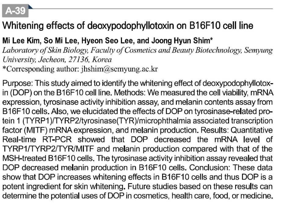 본문 시작 홈으로 커뮤니티 학과소개 학과과정 대학원 커뮤니티 연구동아리 홈페이지가이드 포토갤러리 학과공지 채용정보 학과일정 포토갤러리 유튜브 인스타그램 취업현황 학생회 조직도 졸업생 숏터뷰 포토갤러리 페이스북 트위터 프린트 학과내 동아리 '천만화소(천만가지 화장품소재)' 2020년 한국분자세포생물학회 참가 화장품뷰티생명공학부 6891 2020-10-08 학과내 천만화소 동아리는 10/5~7에 개최된 한국분자세포생물학회에서 'B16F10 세포에서 DOP에 의한 미백효과'라는 제목으로 포스터 발표를 했다. 화장품뷰티생명공학부 김미리, 이소미, 이현서 학생은 세포배양 및 세포생존률 평가, 유전자발현 확인을 통해 신규 미백 기능성 소재를 발굴하여 학계에 보고하는 성과를 달성하였다. 목록 이전2020학년도 "아쿠아디테" 하계 방학 중 특별활동 다음 화장품뷰티생명공학부 1학년 대상 프로그램 실시 담당부서 : 바이오코스메틱학과 담당자 : - 연락처 : 043-649-1638 최종수정일 : 2024-10-26 만족도조사 만족도 조사 이 페이지에서 제공하는 정보에 대하여 만족하시나요? 매우만족 만족 보통 불만족 매우불만족