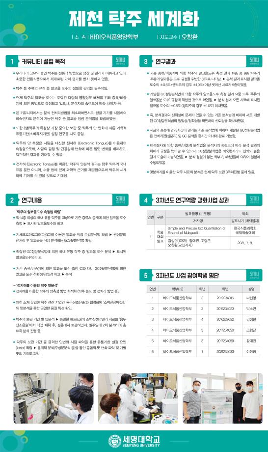 본문 시작 홈으로 커뮤니티 학부소개 진로·취업 교육과정 커뮤니티 대학원 입학상담 홈페이지가이드 갤러리 공지사항 문의게시판 학생회 전공동아리 동문회 갤러리 전공자료실 Youtube Instagram Facebook Blog 갤러리 페이스북 트위터 프린트 2021 대학혁신지원사업 - 3차년도 연구역량 강화세미나 바이오식품산업학부 7052 2021-12-06 2021년 12월 2일 진행된 "2021 대학혁신지원사업 - 3차년도 연구역량 강화세비나"에 오창환 교수가 진행한 "제천탁주세계화"의 결과를 3학년 나선영 학생이 발표하였습니다. 목록 이전2021 실험조리 교과 수익금_학과 발전기금으로 기부 다음 2021학년도 2학기 김지연 교수님_한국조리 담당부서 : 바이오식품산업학부 담당자 : - 연락처 : 043-649-1431 최종수정일 : 2024-10-26 만족도조사 만족도 조사 이 페이지에서 제공하는 정보에 대하여 만족하시나요? 매우만족 만족 보통 불만족 매우불만족