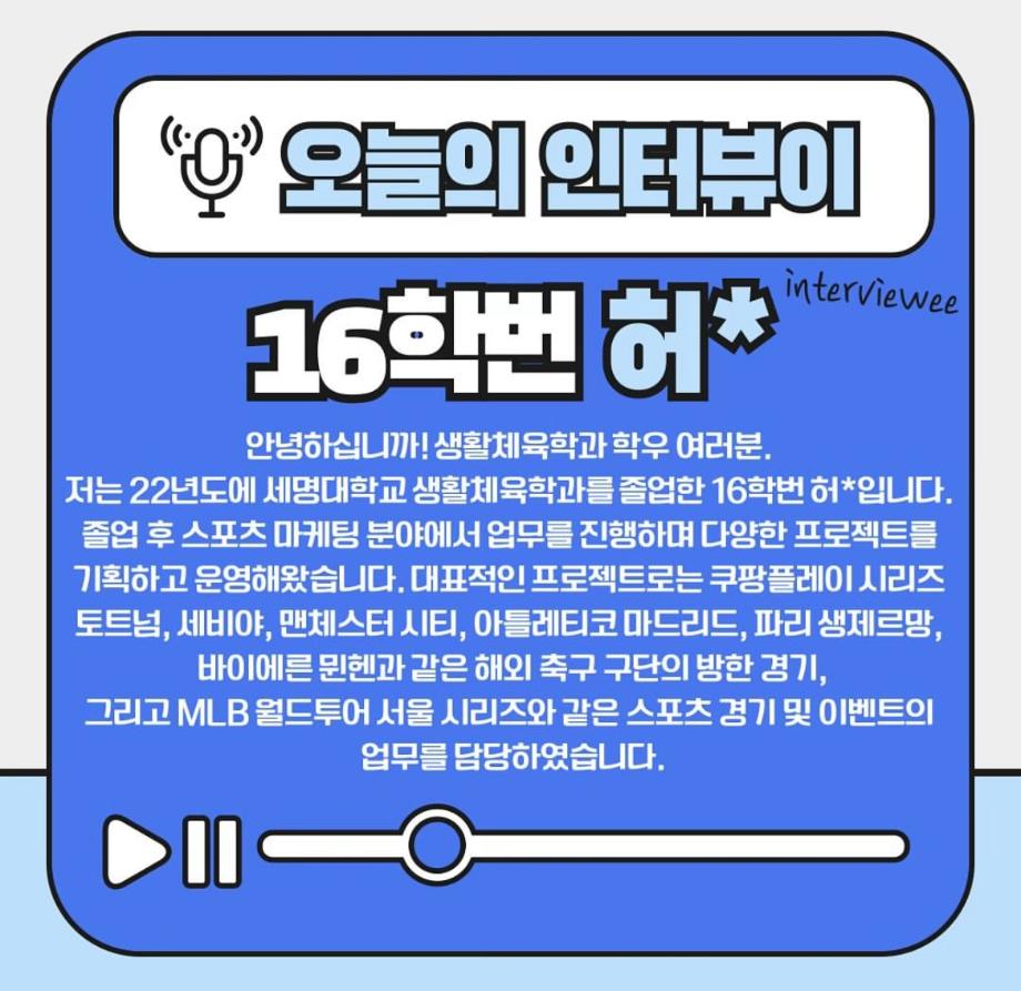 본문 시작 홈으로 커뮤니티SNS 학과소개 진로취업사례 입학안내 교육과정 커뮤니티SNS 홈페이지가이드 학과행사갤러리 학과공지 열린정보SNS 학과동아리 학과행사갤러리 학과MOU 학생회조직도 학과연혁 동문회조직도 학과행사갤러리 페이스북 트위터 프린트 대표 취업자 인터뷰 생활체육학과 1959 2024-07-18 21학년도 졸업생 중 대표 취업자와 인터뷰를 진행했습니다. 목록 이전대표 진학자 인터뷰 다음 2024학년도 학생회 담당부서 : 생활체육학과 담당자 : - 연락처 : 043-469-1289 최종수정일 : 2024-10-26 만족도조사 만족도 조사 이 페이지에서 제공하는 정보에 대하여 만족하시나요? 매우만족 만족 보통 불만족 매우불만족