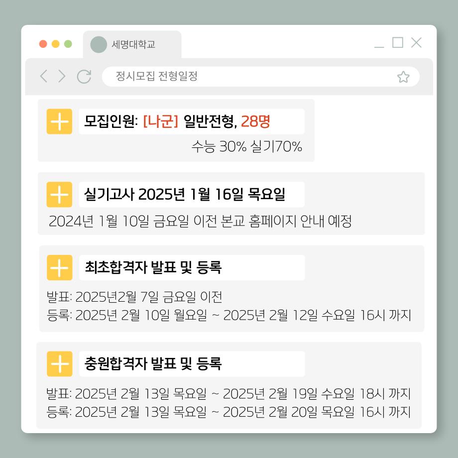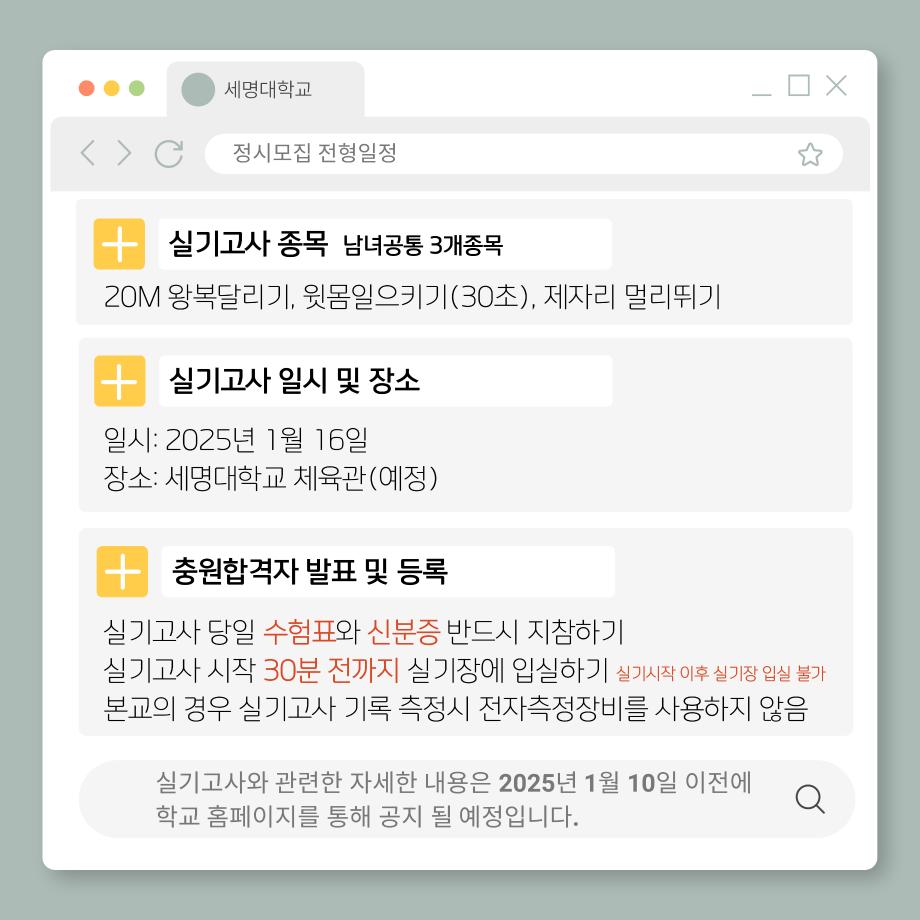 본문 시작 홈으로 커뮤니티SNS 학과소개 진로취업사례 입학안내 교육과정 커뮤니티SNS 홈페이지가이드 학과행사갤러리 학과공지 열린정보SNS 학과동아리 학과행사갤러리 학과MOU 학생회조직도 학과연혁 동문회조직도 학과행사갤러리 페이스북 트위터 프린트 2025학년도 정시 실기고사 생활체육학과 3266 2025-01-09 2025학년도 세명대학교 생활체육학과 정시모집 전형일정 및 실기고사 안내입니다 ! 목록 이전2024학년도 동계스포츠 다음 2025학년도 정시 실기고사 시행 담당부서 : 생활체육학과 담당자 : - 연락처 : 043-469-1289 최종수정일 : 2024-10-26 만족도조사 만족도 조사 이 페이지에서 제공하는 정보에 대하여 만족하시나요? 매우만족 만족 보통 불만족 매우불만족