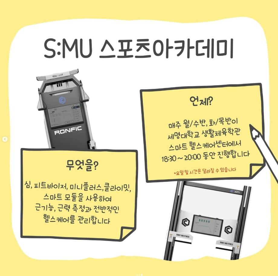 본문 시작 홈으로 커뮤니티SNS 학과소개 진로취업사례 입학안내 교육과정 커뮤니티SNS 홈페이지가이드 학과행사갤러리 학과공지 열린정보SNS 학과동아리 학과행사갤러리 학과MOU 학생회조직도 학과연혁 동문회조직도 학과행사갤러리 페이스북 트위터 프린트 S:MU 스포츠아카데미 AI 피트니스 소개 생활체육학과 2150 2025-07-31 S:MU 스포츠아카데미 AI 피트니스를 소개합니다👏🏻 AI 피트니스 장비를 통해 근력 향상뿐만 아니라 골프, 축구, 야구 등 다양한 스포츠 종목에서 접목시킬 수 있으니 관심 있는 학우분들은 참고 부탁드립니다⛳️⚽️⚾️ 더 자세한 내용이 궁금하시다면 학교 홈페이지를 방문해 주시길 바랍니다😊 목록 이전생활체육학과 제30대 학회장 선거 다음 전국 파라미타 청소년연합회 학과체험 담당부서 : 생활체육학과 담당자 : - 연락처 : 043-469-1289 최종수정일 : 2024-10-26 만족도조사 만족도 조사 이 페이지에서 제공하는 정보에 대하여 만족하시나요? 매우만족 만족 보통 불만족 매우불만족