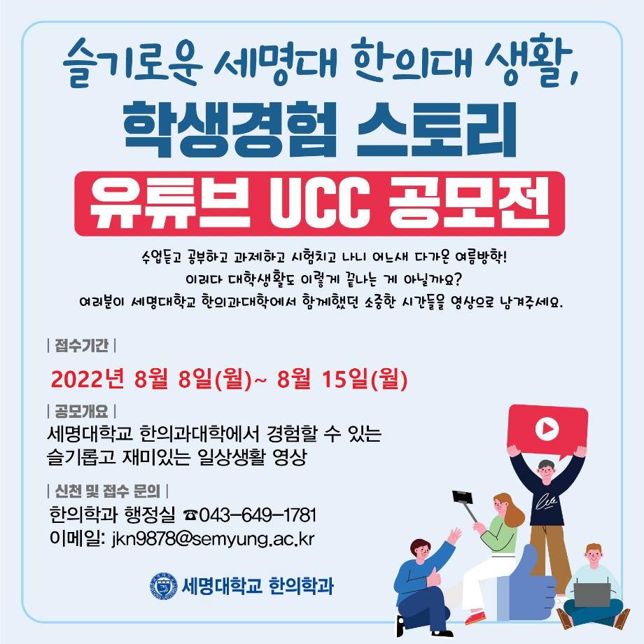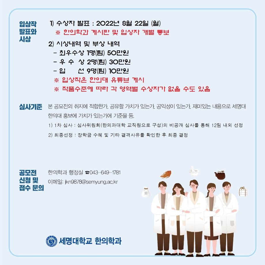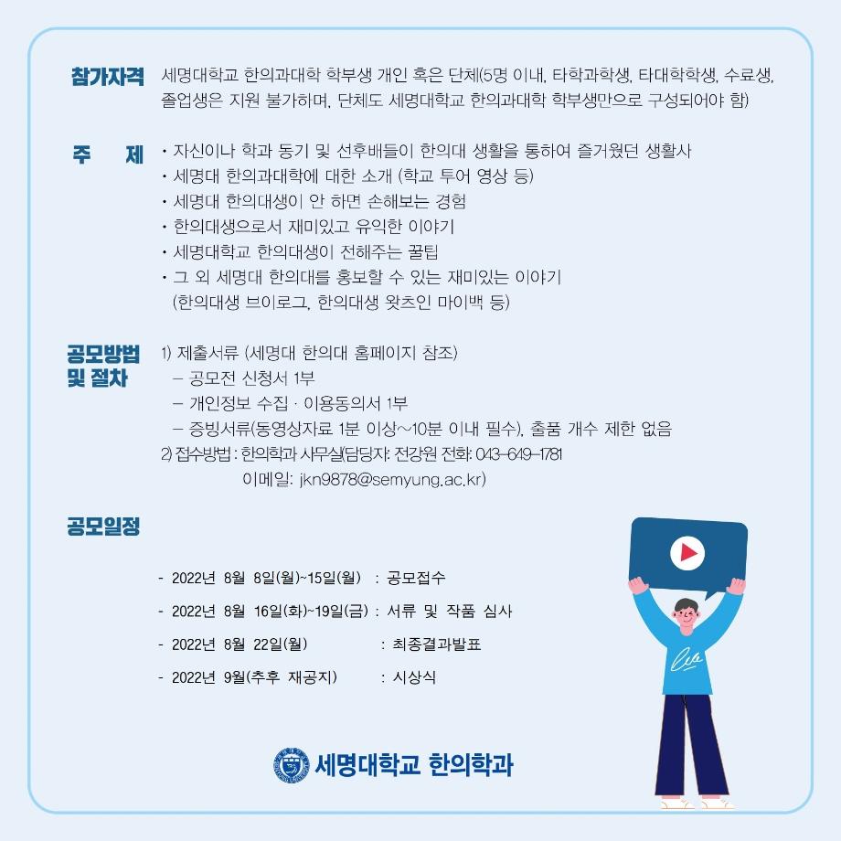 본문 시작 홈으로 대학소식 대학소개 교수소개 대학과정 커뮤니티 대학원 대학소식 홈페이지가이드 포토갤러리 학과공지 포토갤러리 발전기금 위원회 관련사이트 포토갤러리 페이스북 트위터 프린트 슬기로운 한의대 생활 학생경험 스토리 유튜브 UCC 공모전 한의과대학 3092 2022-07-01 슬기로운 한의대 생활 학생경험 스토리 유튜브 UCC 공모전 접수기간 : 2022.08.08(월) ~ 2022.08.15(월) 신청 및 접수 : 한의학과 행정실 (043-649-1781) 이메일 주소 : jkn9878@semyung.ac.kr 목록 이전[중등교육 연계프로그램] 충주 대원고등학교 특강 다음 <2022년 7월 1일자 한의과대학 보직 임명사항 안내> 담당부서 : 한의과대학 담당자 : - 연락처 : 043-649-1701 최종수정일 : 2024-10-26 만족도조사 만족도 조사 이 페이지에서 제공하는 정보에 대하여 만족하시나요? 매우만족 만족 보통 불만족 매우불만족