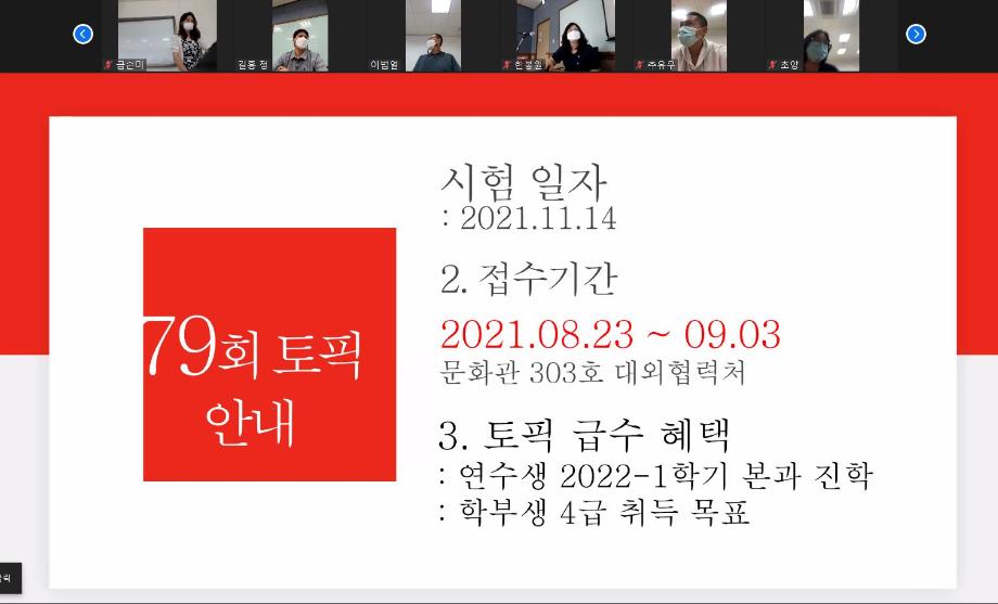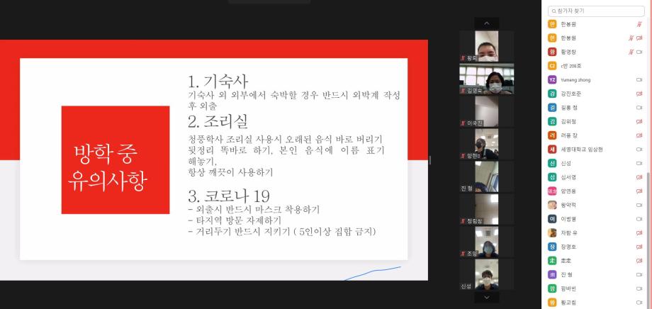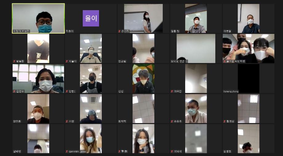 본문 시작 2021-여름 한국어연수생 종강식 국제교육원 2329 2021-08-13 2021-여름 한국어연수생 종강식 코로나19로 인해 비대면 종강식을 실시하였습니다. 목록 이전2021-여름 생활적응지원프로그램 다음 2021-가을학기 신입생 오리엔테이션 담당부서 : 국제교육원 담당자 : - 연락처 : 043-649-1185 최종수정일 : 2024-10-26 만족도조사 만족도 조사 이 페이지에서 제공하는 정보에 대하여 만족하시나요? 매우만족 만족 보통 불만족 매우불만족