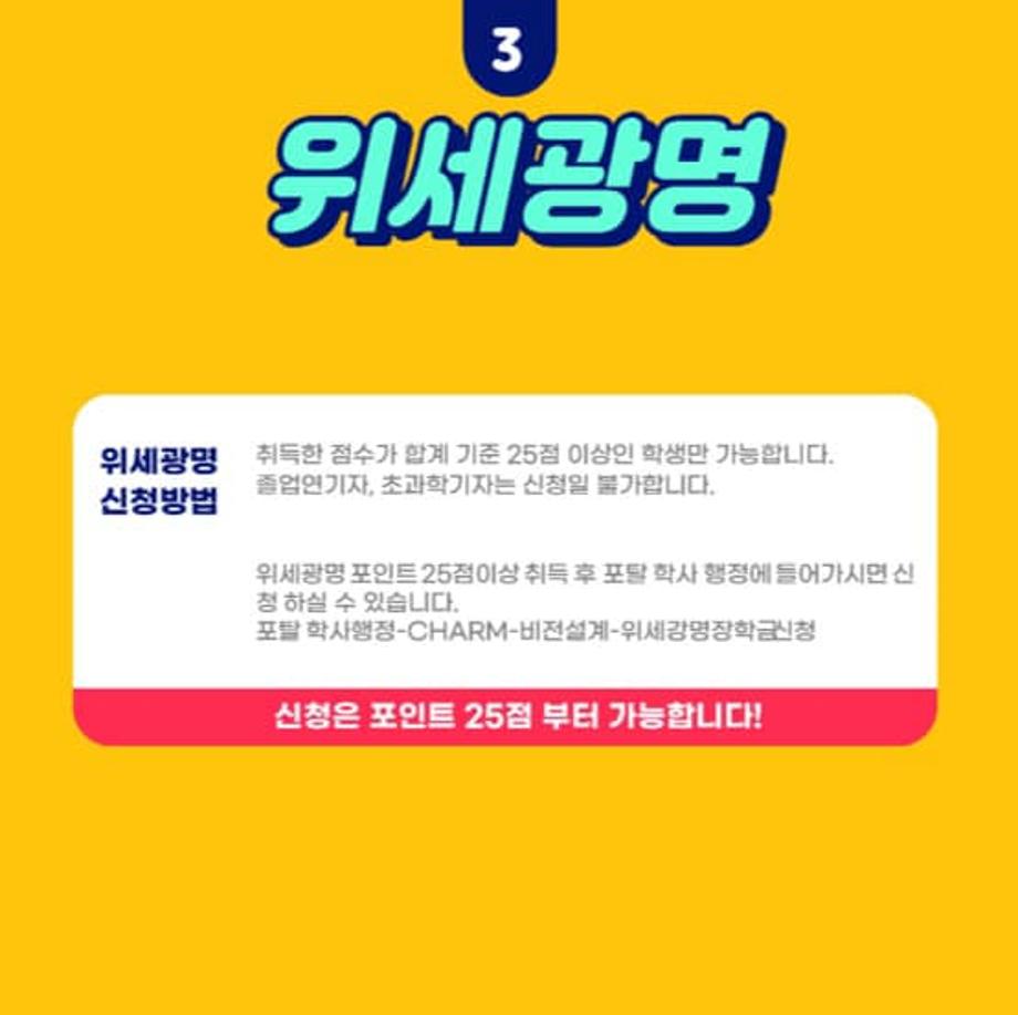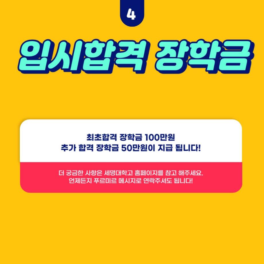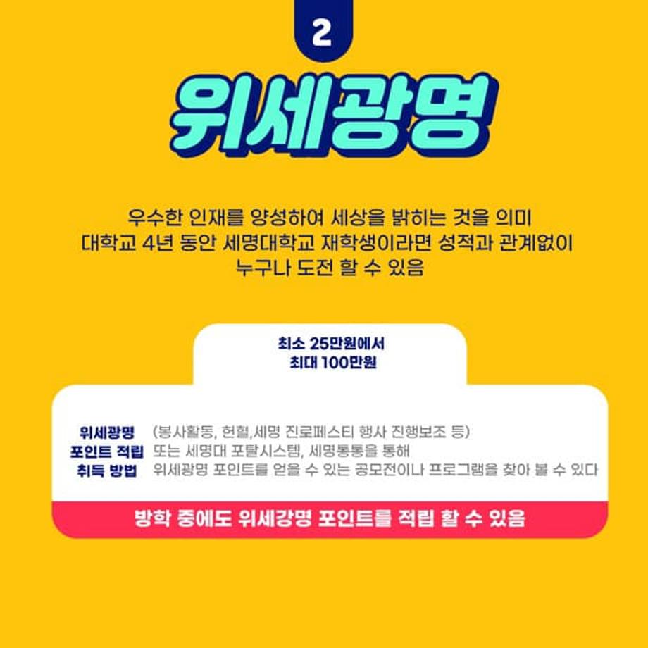 또한, 세명대학교에서 다양한 프로그램을 통해 위세광명 포인트를 얻고 이를 통해 장학금을 받을 수 있는 ✨위세광명 포인트✨ 와 이번 입시생분들을 위한 최초합격 장학금 100만원, 추가 합격 장학금 50만원이 지급될 예정이오니 입시생분들의 많은 관심 부탁드립니다 💰💙