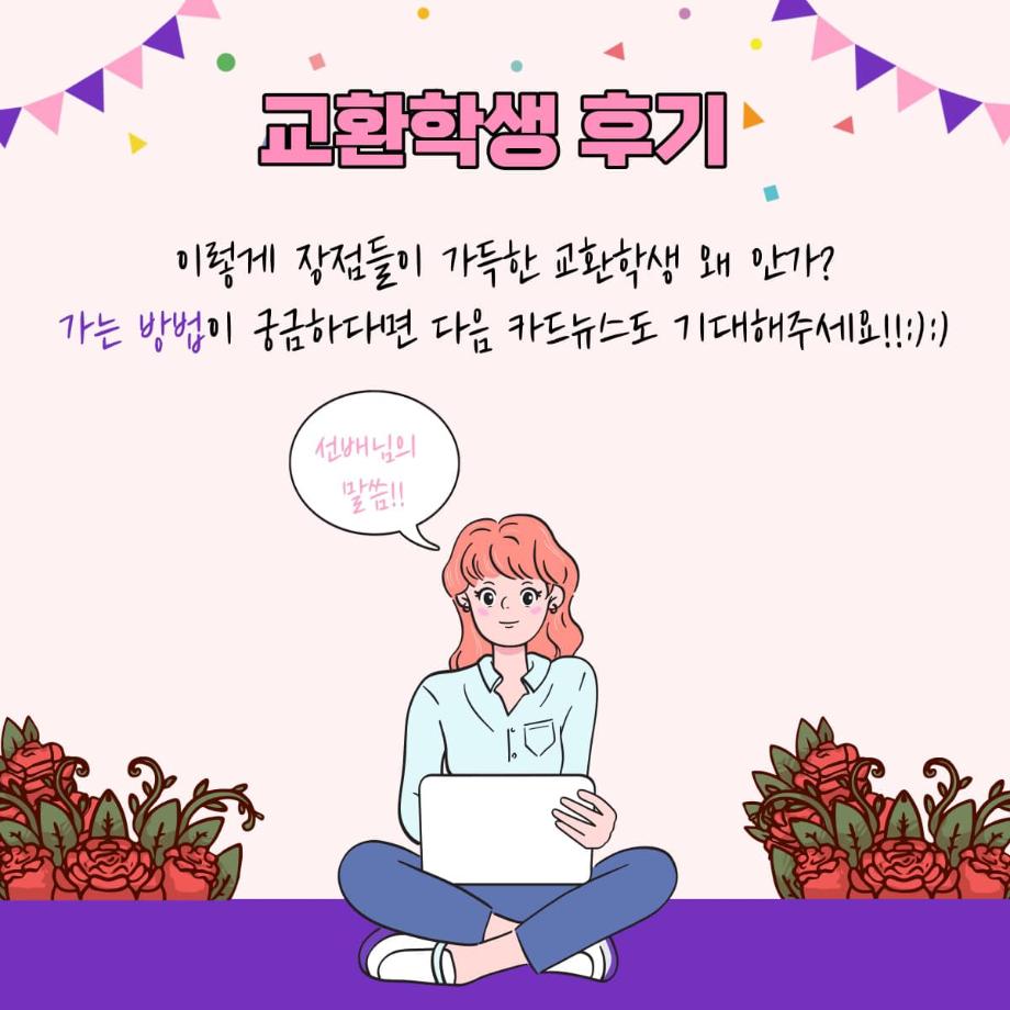 그 중 말레이시아 쿠알라룸푸르대학으로 교환학생을 직접 다녀오신 20학번 재학생분의 생생한 후기를 카드뉴스로 제작해보았습니다 🔍