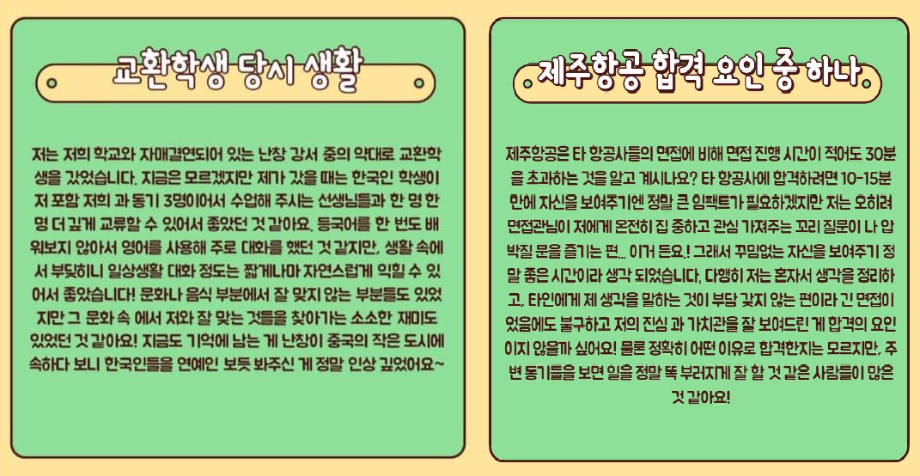 세명대학교 항공서비스학과 17학번 이ㅇ민, 19학번 김ㅇ연 선배님들께서 직접 답해주신 항공사 최종합격의 비밀들과 꿀팁을 담아보았습니다 📝