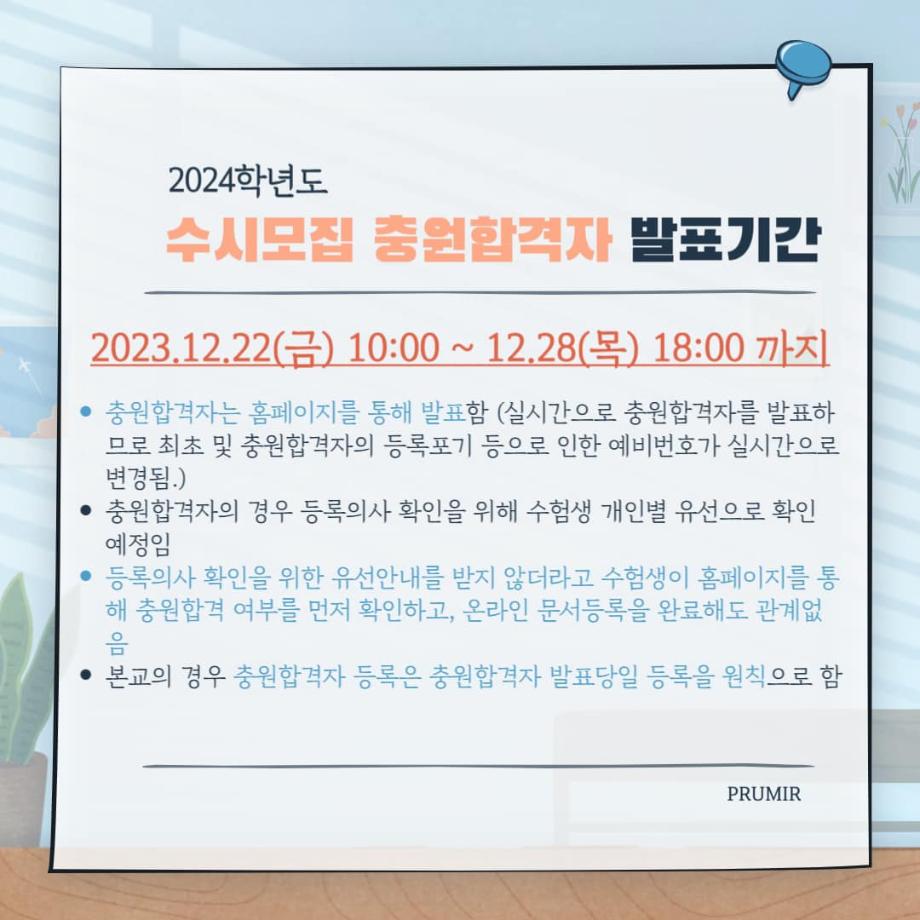 ✨2023.12.22(금) 10:00 ~ 12.28(목) 18:00✨ 7일간 세명대학교 2024학년도 수시모집 충원합격자 발표가 진행됩니다 🙌