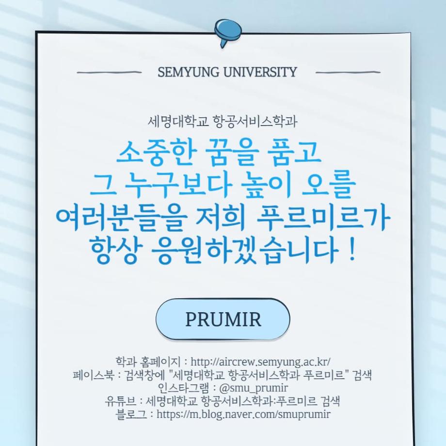 안녕하십니까 세명대학교 항공서비스학과 온라인 홍보국 💙푸르미르💙입니다
