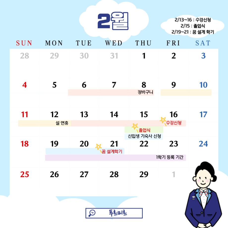 2월에는 4년간 학교생활을 마무리하는 20학번 선배님들의 🎓졸업식부터 신입생들을 위한 OT 행사인 ✨꿈 설계 학기 등 여러 일정이 준비되어 있습니다🙆♀️