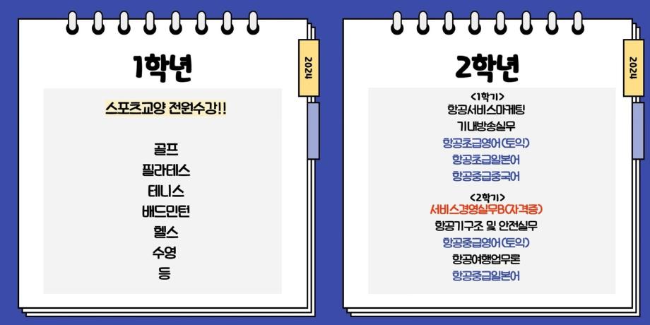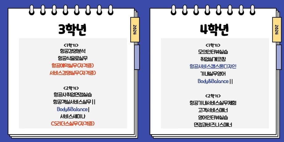 항공경영분석, 항공식음료실무, 항공예약실무(자격증), 서비스경영실무(자격증), 항공사취업면접실습 항공객실서비스실무 II, Body&Balance |, 서비스세미나, CS리더스실무 (자격증)