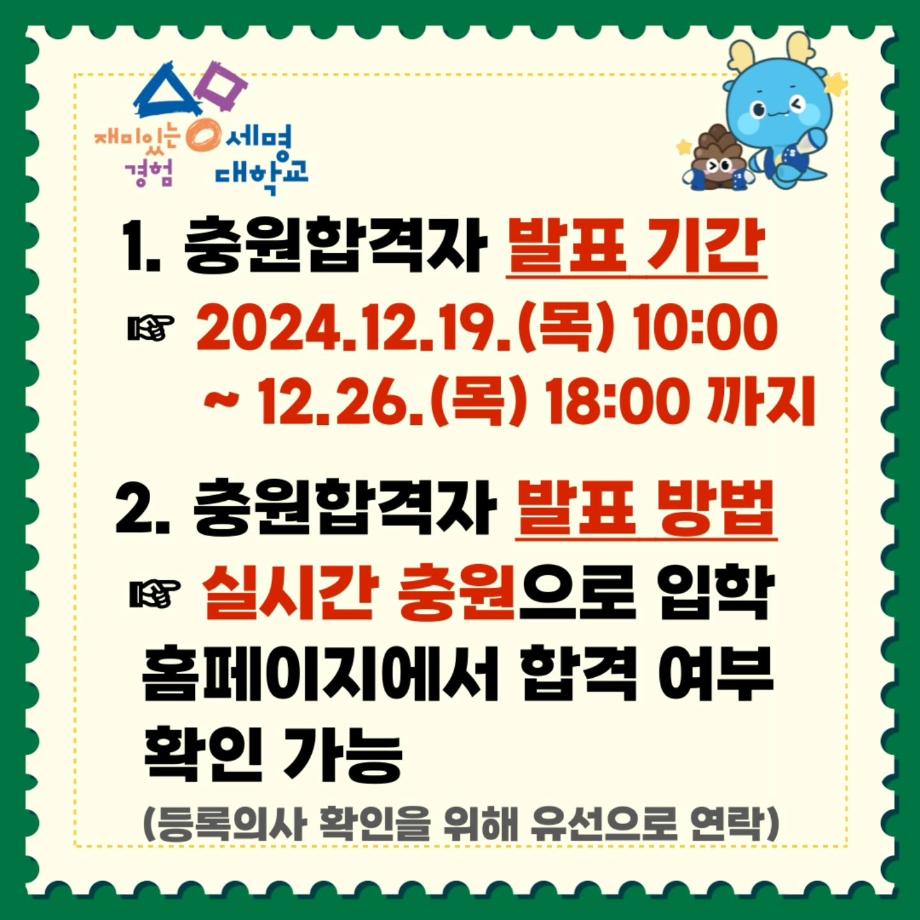 12월 19일부터 12월26일까지 충원합격자 발표 및 등록이 시작됩니다.