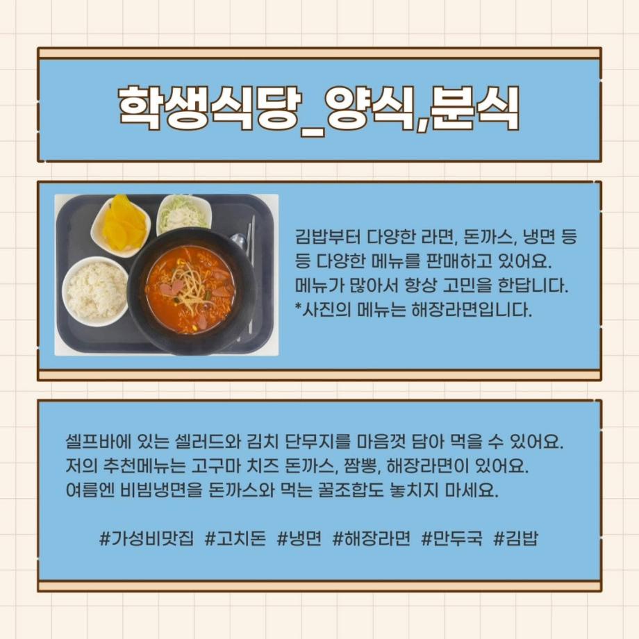 세명대학교 학생식당👩🍳🧑🍳은 학생들의 건강과 만족을 최우선으로 생각하는 공간입니다. 다양한 메뉴🍜와 합리적인 가격💰으로, 매일 바쁜 학업 중에서도 맛있고 든든한 식사를 제공해 주십니다. 세명대학교 학생식당은 맛있고 건강한 한 끼를 제공하며, 학생들의 지친 학업📚에 삶의 활력💪을 더해주는 소중한 공간입니다. 언제든지 방문하여 맛있는 음식을 즐겨보세요!😁