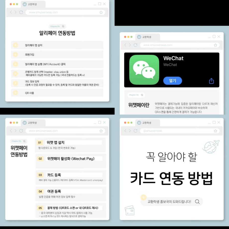 본문 시작 홈으로 커뮤니티 학과소개 입학정보 교과과정 커뮤니티 홈페이지가이드 포토갤러리 SNS 소통 공간 포토갤러리 공지사항 동아리 포토갤러리 페이스북 트위터 프린트 중국 카드 연동 방법 항공서비스학과 4389 2025-05-05 안녕하십니까 세명대학교 항공서비스학과 온라인 홍보국 💙푸르미르💙입니다. 오늘은 중국 교환학생에서 꼭 필요한 카드연동 방법 카드뉴스를 가져와보았습니다 😊 많은 도움이 되길 바랍니다!! 소중한 꿈을 품고 그 누구보다 높이 오를 여러분을 저희 "푸르미르" 가 항상 응원하겠습니다 ✈💙 궁금한 사항이 있으시다면 언제든지 SNS로 연락 주십시오 💬 #세명대학교 #항공서비스학과 #세명대 #항공과 #푸르미르 #카드연동 #카드 #중국 #교환학생 목록 이전5월 다이어리 다음 김포공항 국립박물관 견학