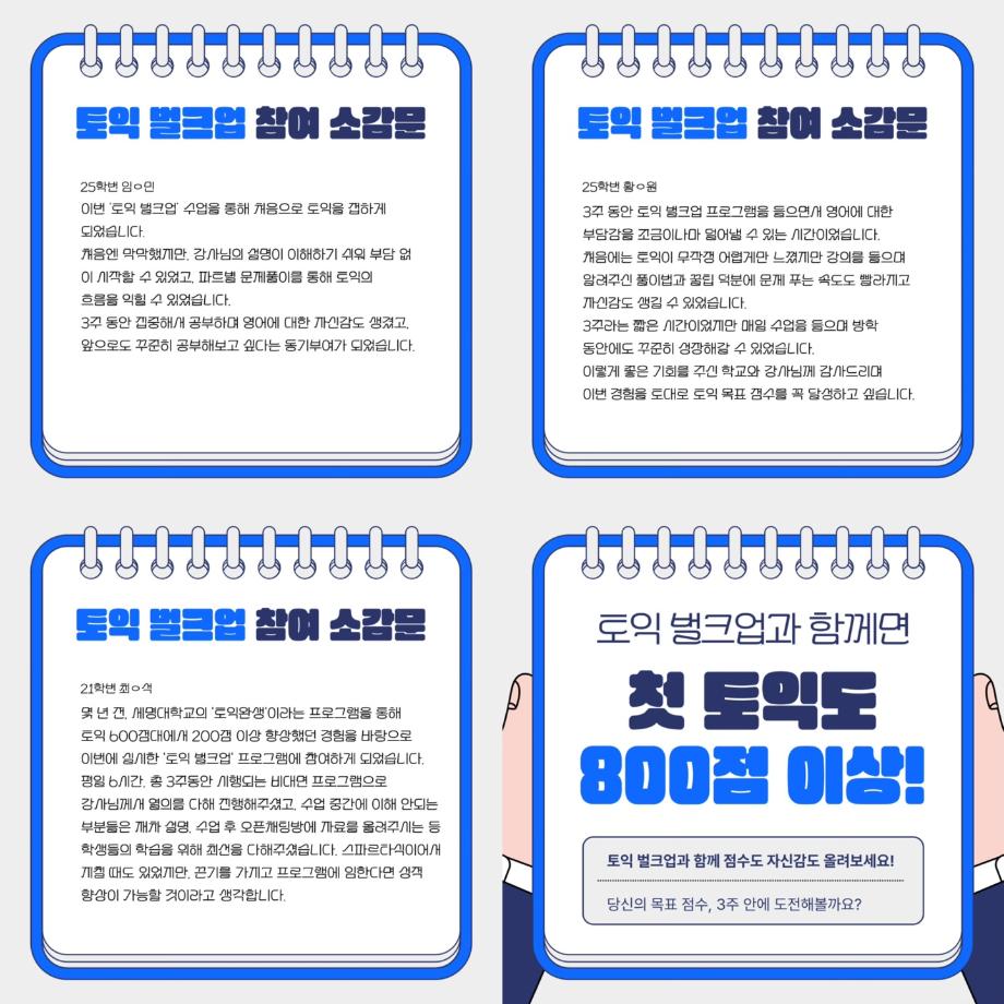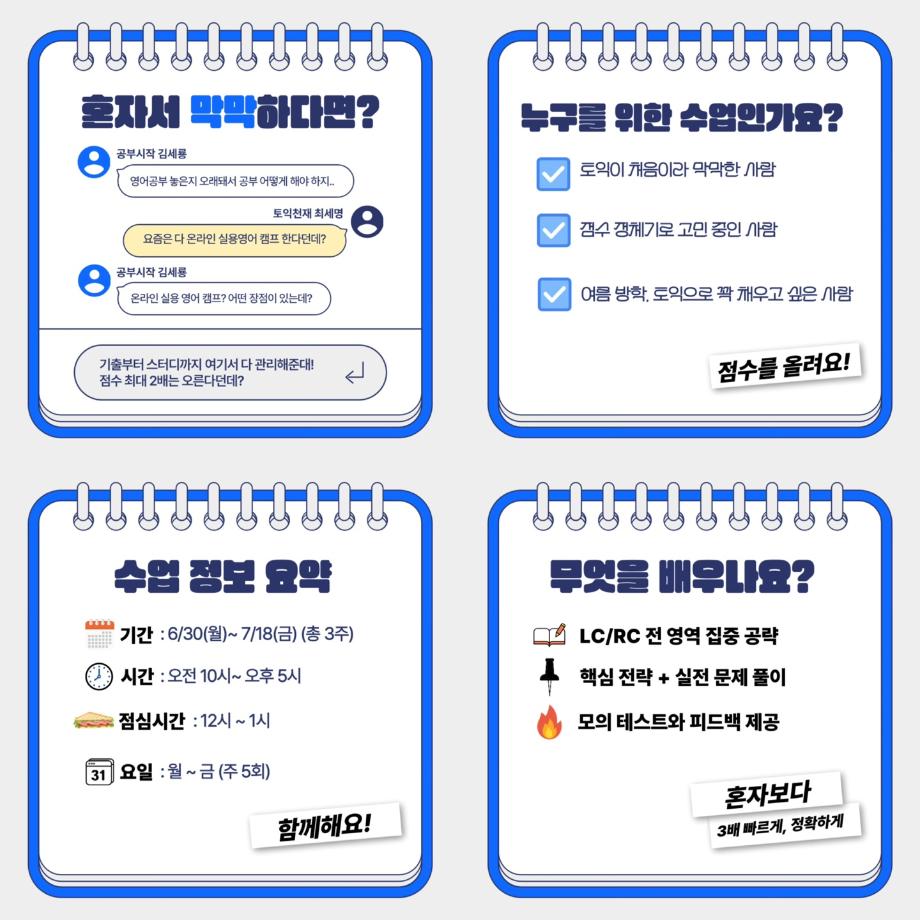 여름 방학☀️을 맞이해 토익 스파르타 벌크업이 진행되었습니다! 학생들은 LC·RC 전 영역을 집중 학습하고 매일 모의고사와 피드백을 통해 실전 감각📖을 높였습니다! 이런 프로그램을 활용해 어학 능력을 향상시키길 바랍니다 ☺️
