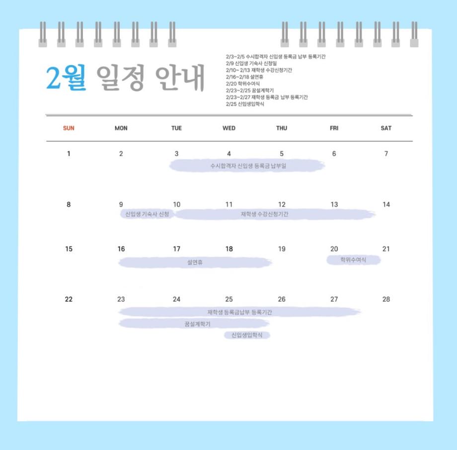 2월에는 학사와 관련된 주요 일정이 예정되어 있으니 확인하시고 일정에 착오 없으시길 바랍니다