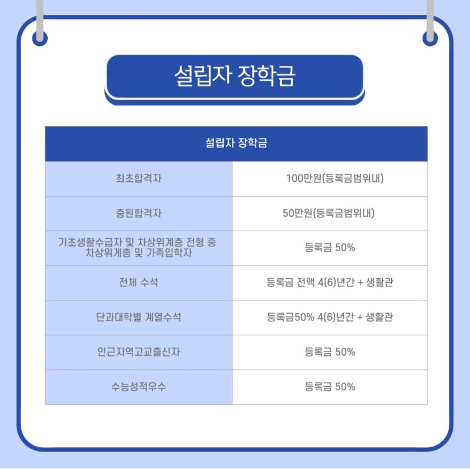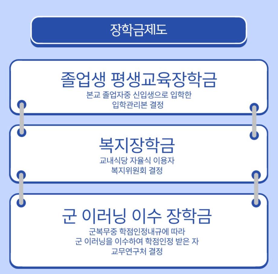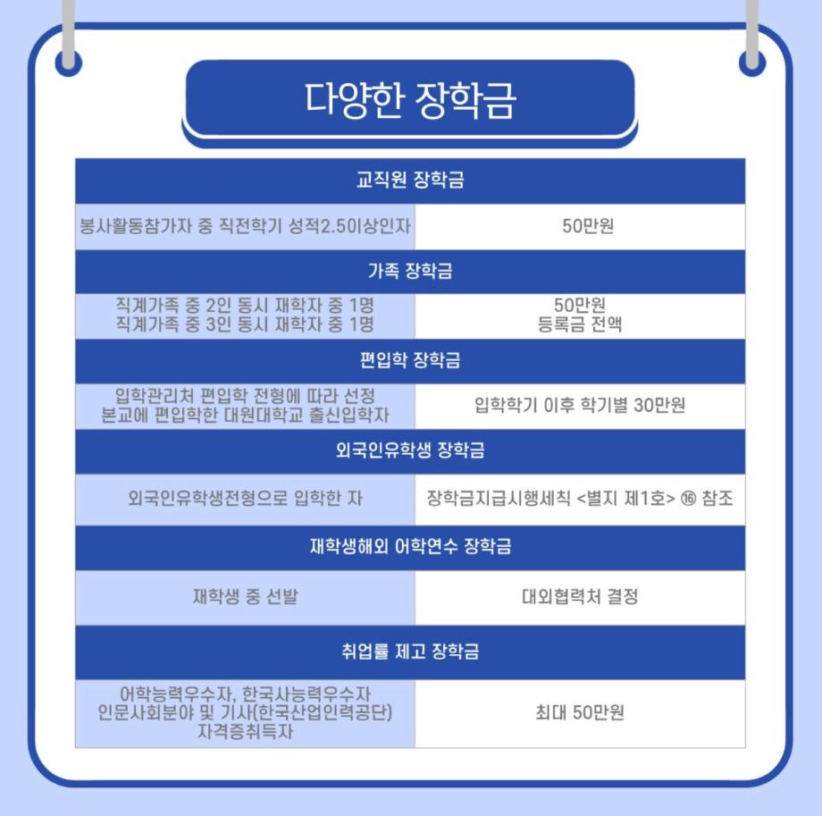 다양한 장학금 혜택을 통하여 학생들이 교육에 집중할 수 있도록 도와주고 있습니다!