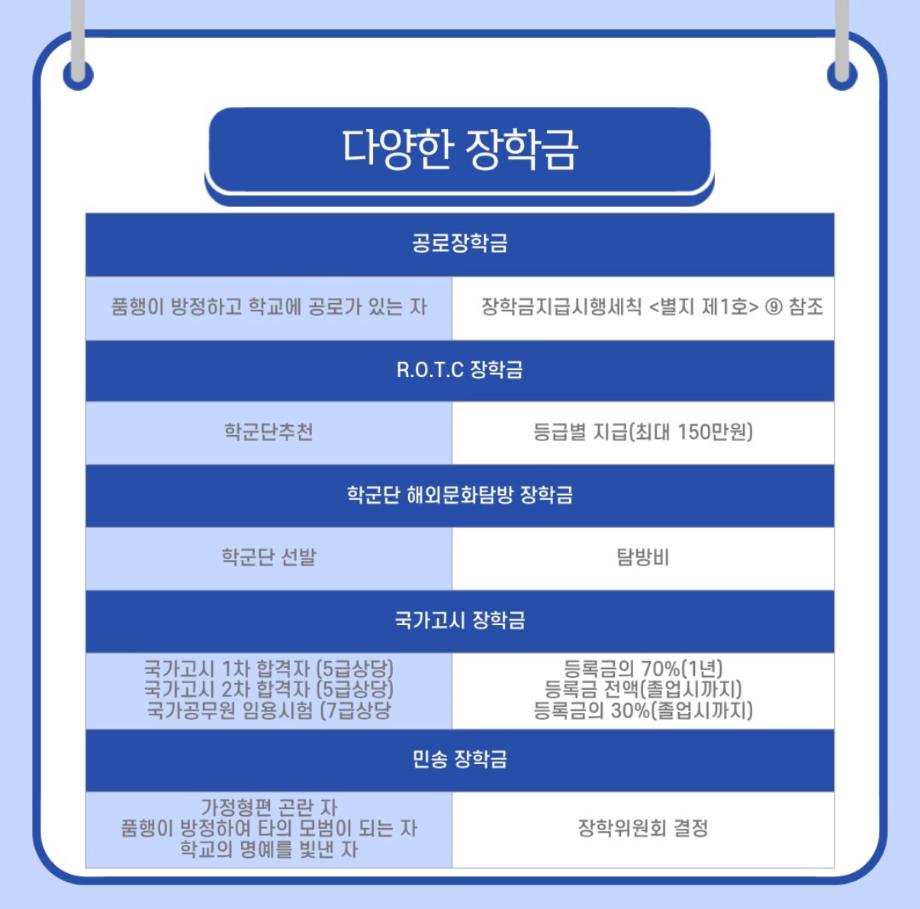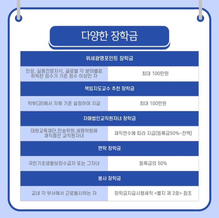 오늘은 세명대학교의 장점 중 하나인 장학금 제도에 관하여 소개해드리고자 합니다!