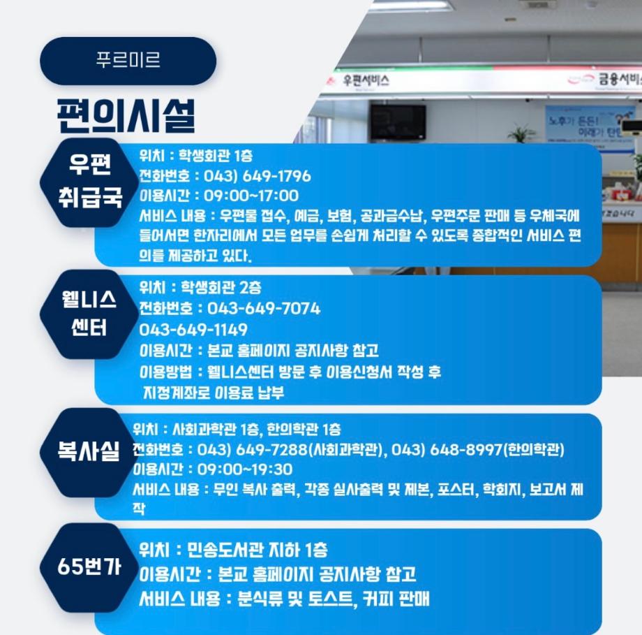 편의점, 헬스장, 우체국 등 여러 가지 편의시설들을 교내에서 편리하게 이용하실 수 있습니다!