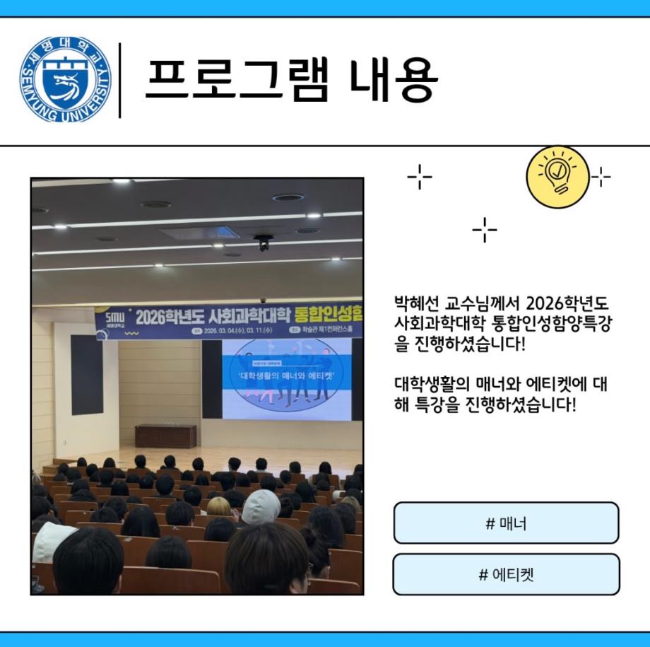 이번 특강을 통해 학생들은 다양한 대학생활에서 필요한 인성과 태도를 배우면서 의미 있는 시간을 가졌습니다🩵