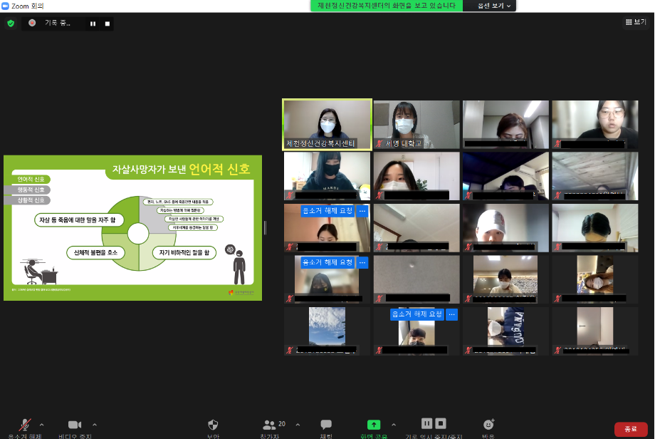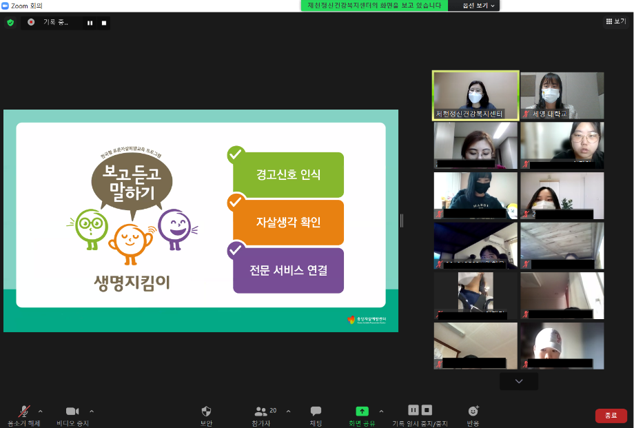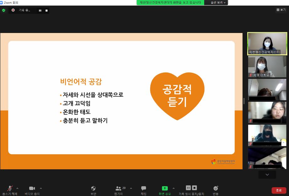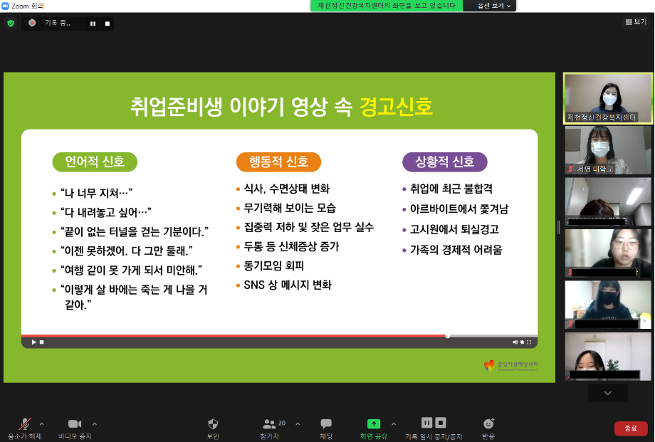 본문 시작 2021학년도 건강상담의 날 "자살예방교육"(10.26) 실시 CHARM케어상담센터 3629 2021-10-26 <건강상담의 날 "자살예방교육" 실시> 일시 : 10/26(화) 14:00~15:00 강사 : 제천시정신건강복지센터 팀장 신효진 목록 이전인권서포터즈 사회복지의날 캠페인 진행 다음 교내 폭력예방 캠페인 진행 담당부서 : CHARM케어상담센터 담당자 : - 연락처 : 043-649-1789 최종수정일 : 2024-10-26 만족도조사 만족도 조사 이 페이지에서 제공하는 정보에 대하여 만족하시나요? 매우만족 만족 보통 불만족 매우불만족